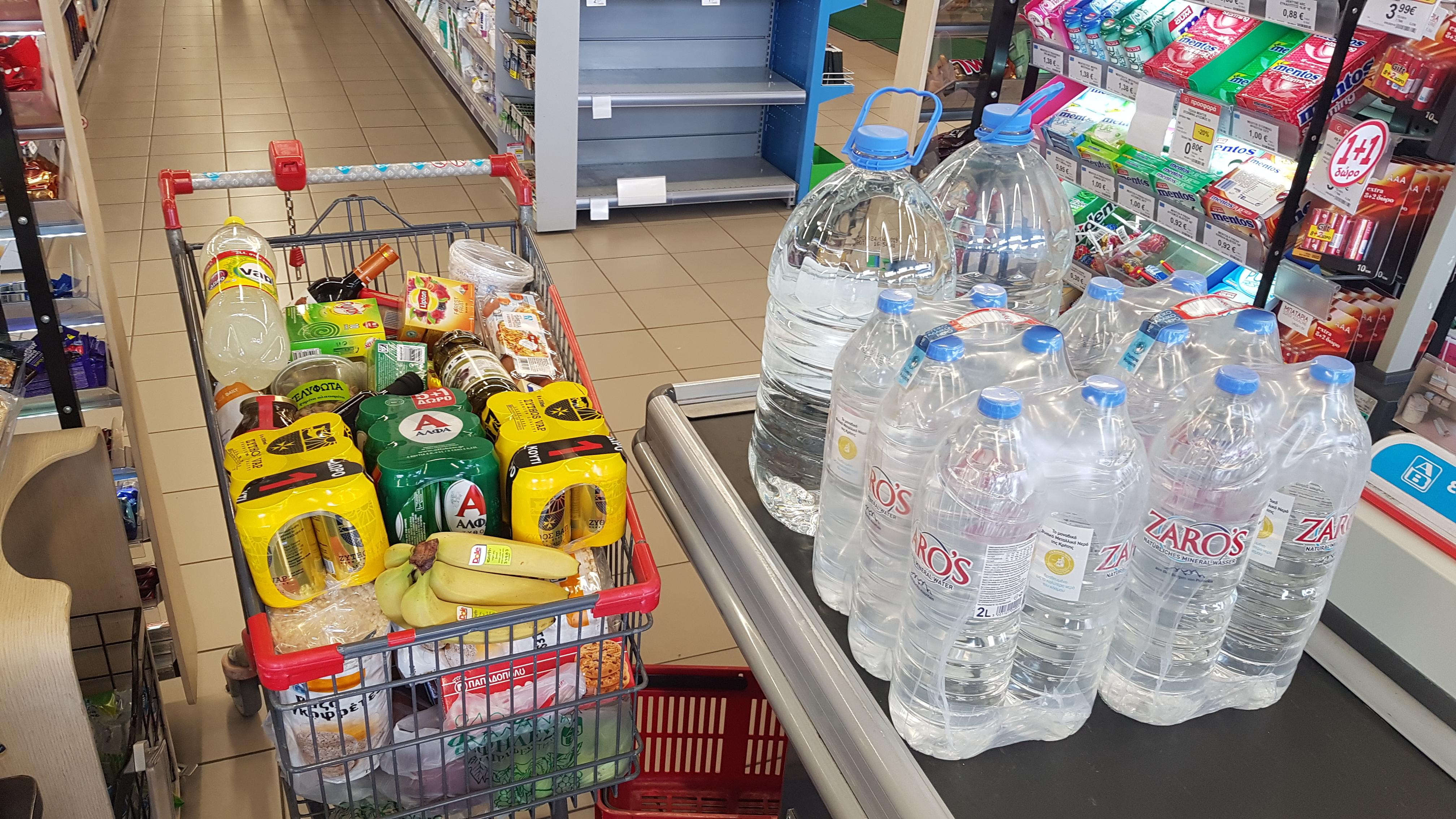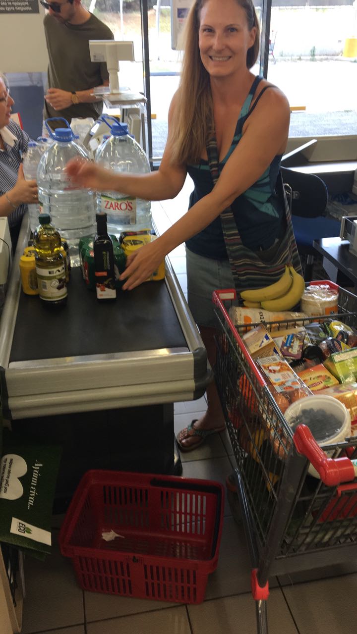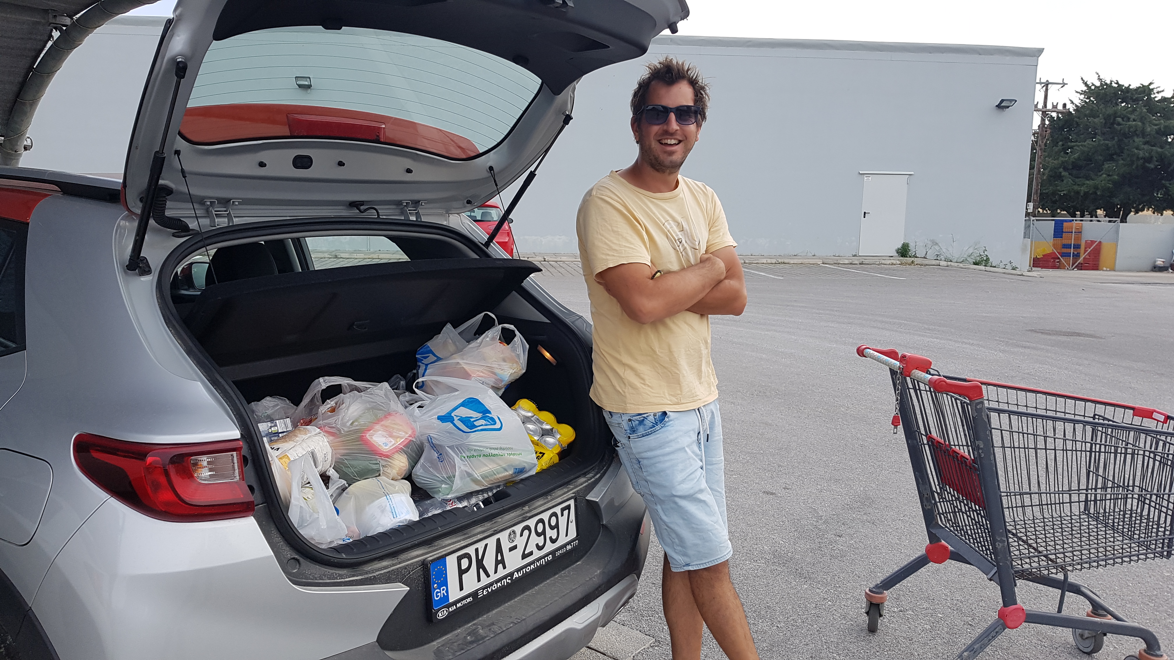 Bevor die meisten der Teilnehmer bereits am Freitag in Rhodos ankamen, haben Stef und ich zunächst mal die Einkäufe erledigt. Es war gar nicht so einfach zu wissen, wieviel man so für 10 Leute einkauft. Frühstück für Sonntag und Montag sowie Abendessen für 1-2 mal wollten wir einkalkulieren. Also haben wir kurzerhand eine Liste in unsere WhatsApp Gruppe gestellt, was wir alles einkaufen wollten. Diese wurde fleißig mit Sonderwünschen ergänzt, sodass wir am Schluss mit zwei Einkaufswägen voll und ca 200 Euro weniger den Supermarkt verlassen haben. Auch genügend Wasser sollte im Gepäck sein, bis wir am Montag in Kalymnos die Wasservorräte wieder auffüllen konnten.