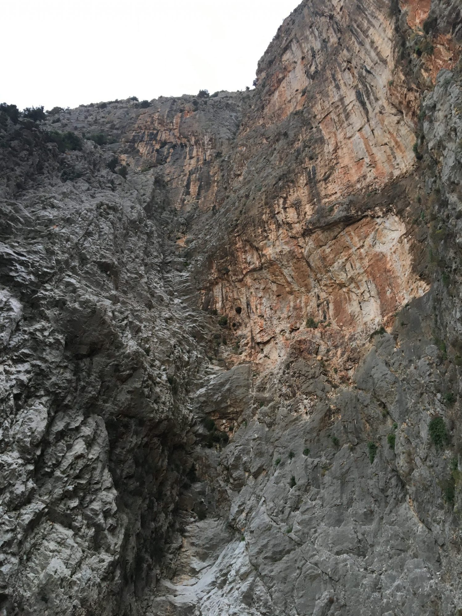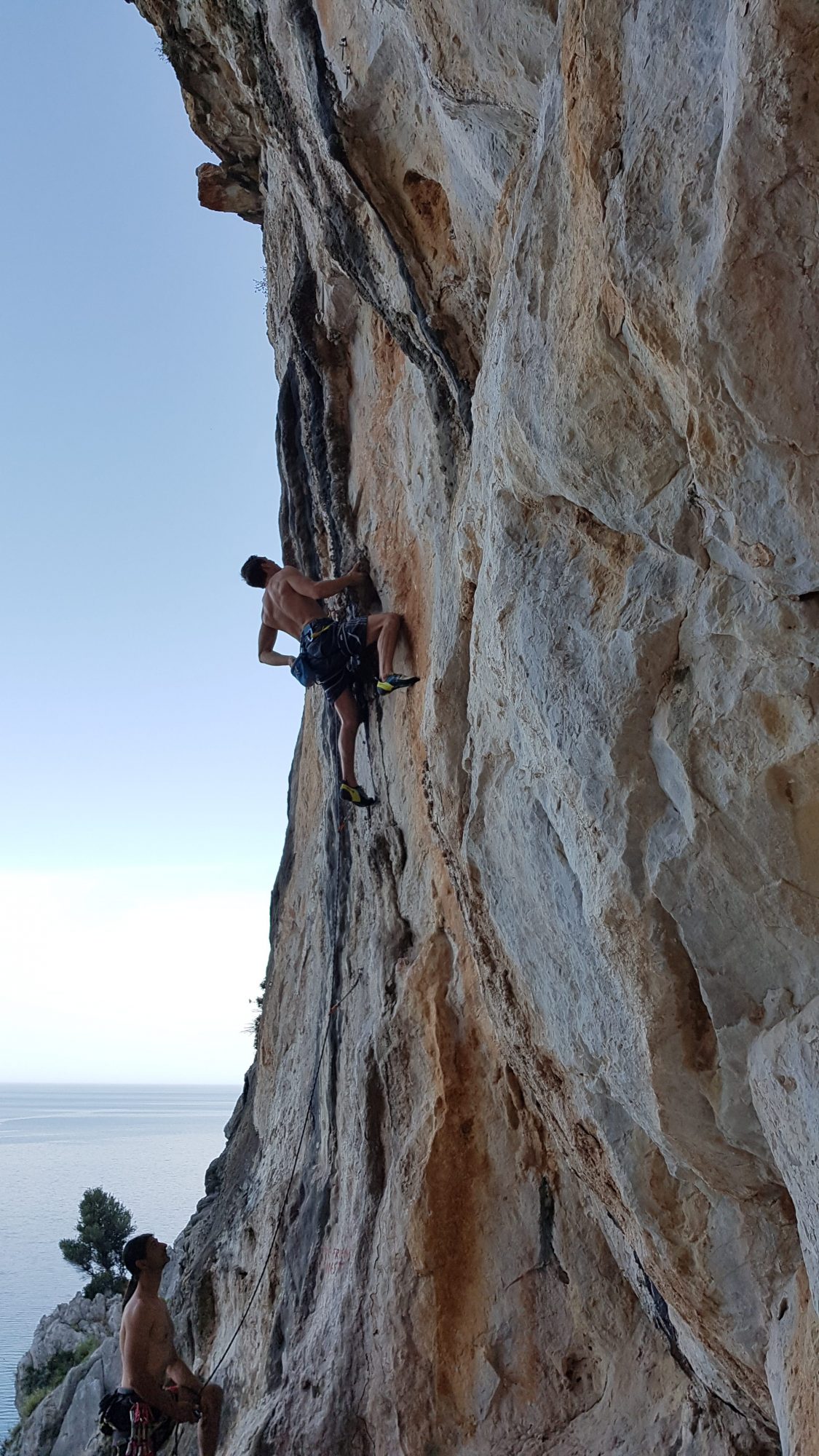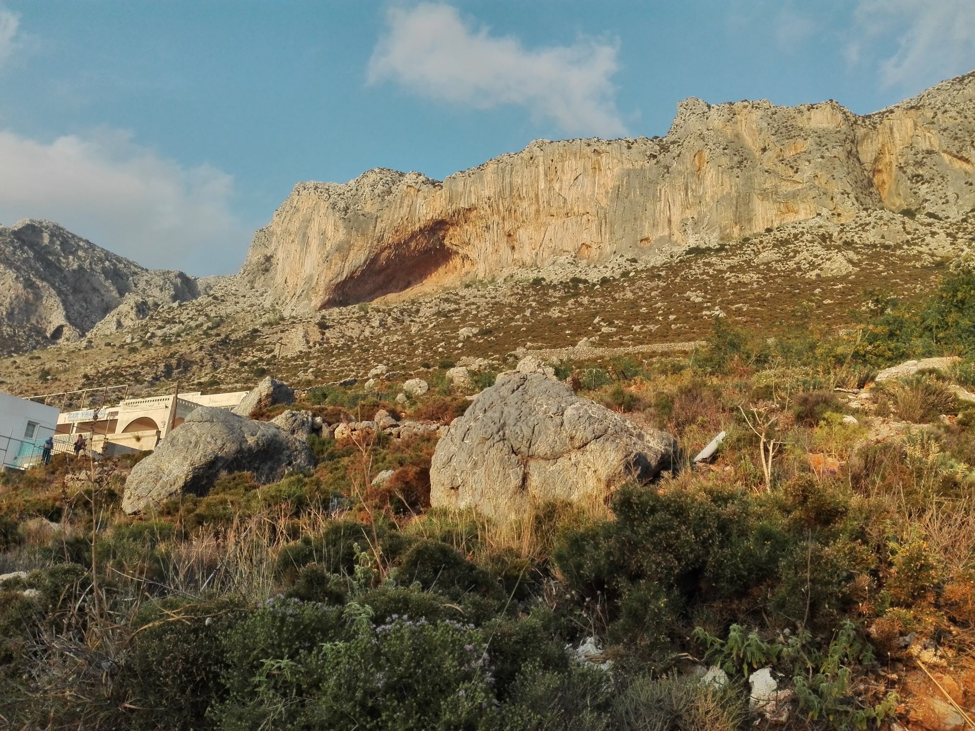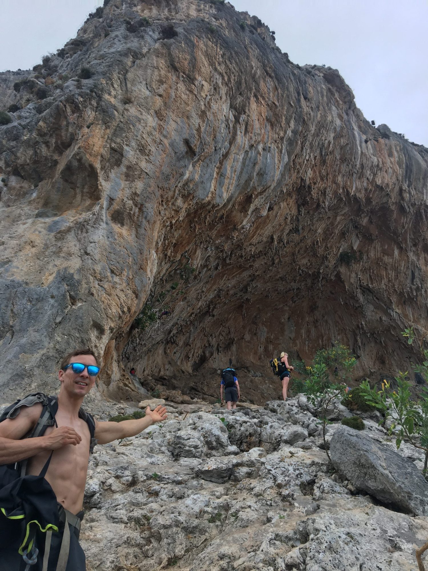 Der Donnerstag war unser letzter Klettertag auf Kalymnos. Und wo kann es sonst hingehen als zur berühmten Grande Grotta. Die Sektoren Panorama (rechts) und Afternoon, Spartan Wall und Spartacus (links) bieten in allen Schwierigkeitsgraden erneut spannende Klettermöglichkeiten für jeden aus unserer Gruppe. Doch zunächst gingen wir in der Nähe des Monster Cafés vor Anker und durften durch einen Privatgrund vom Meer zur Straße spazieren, um ein ordentliches Frühstück zu genießen.