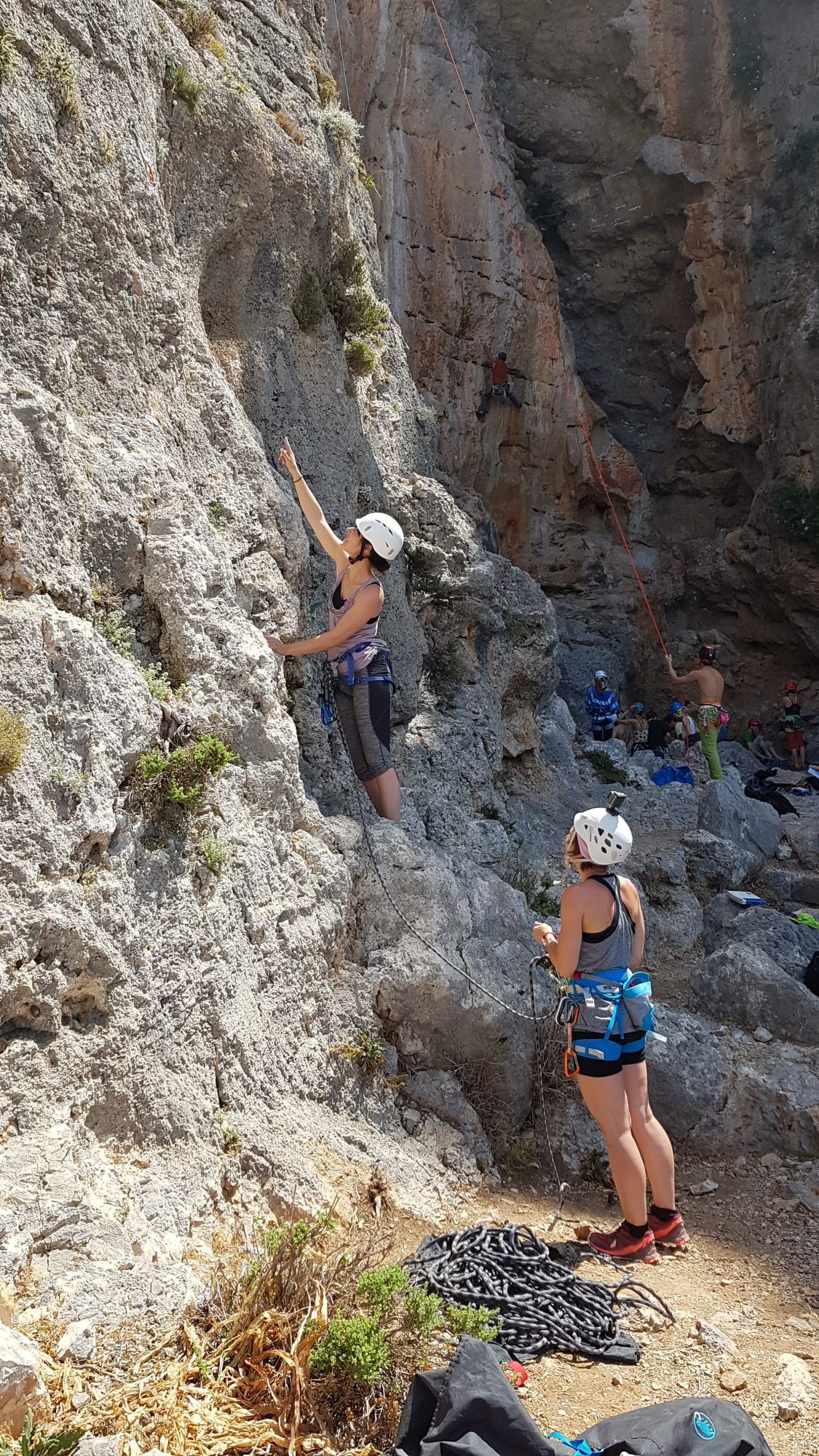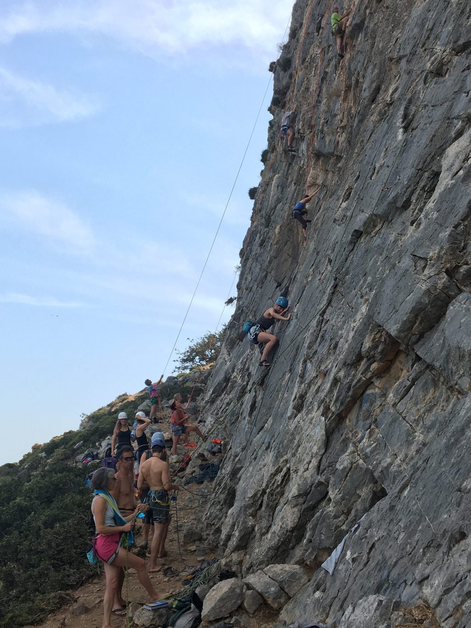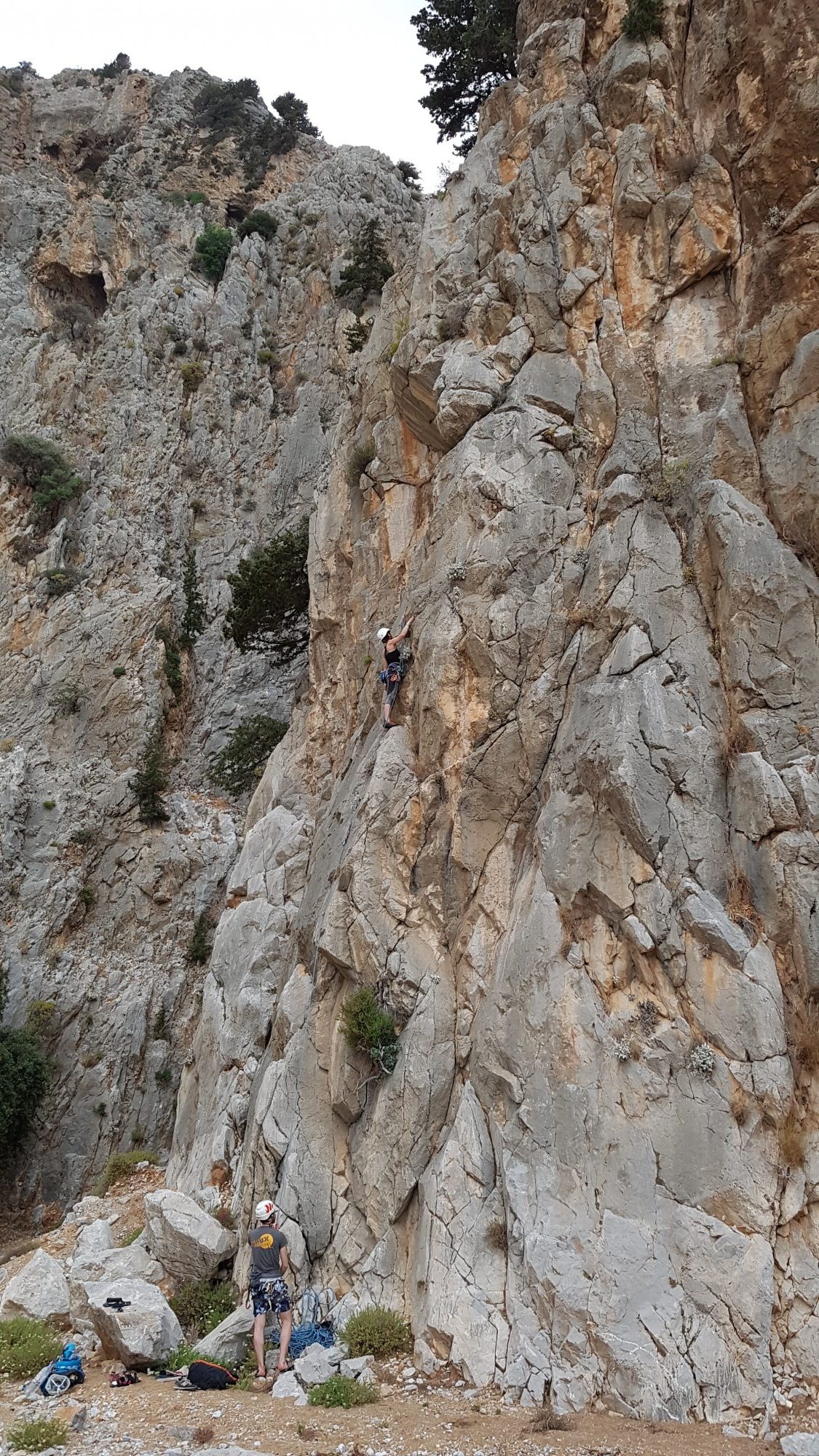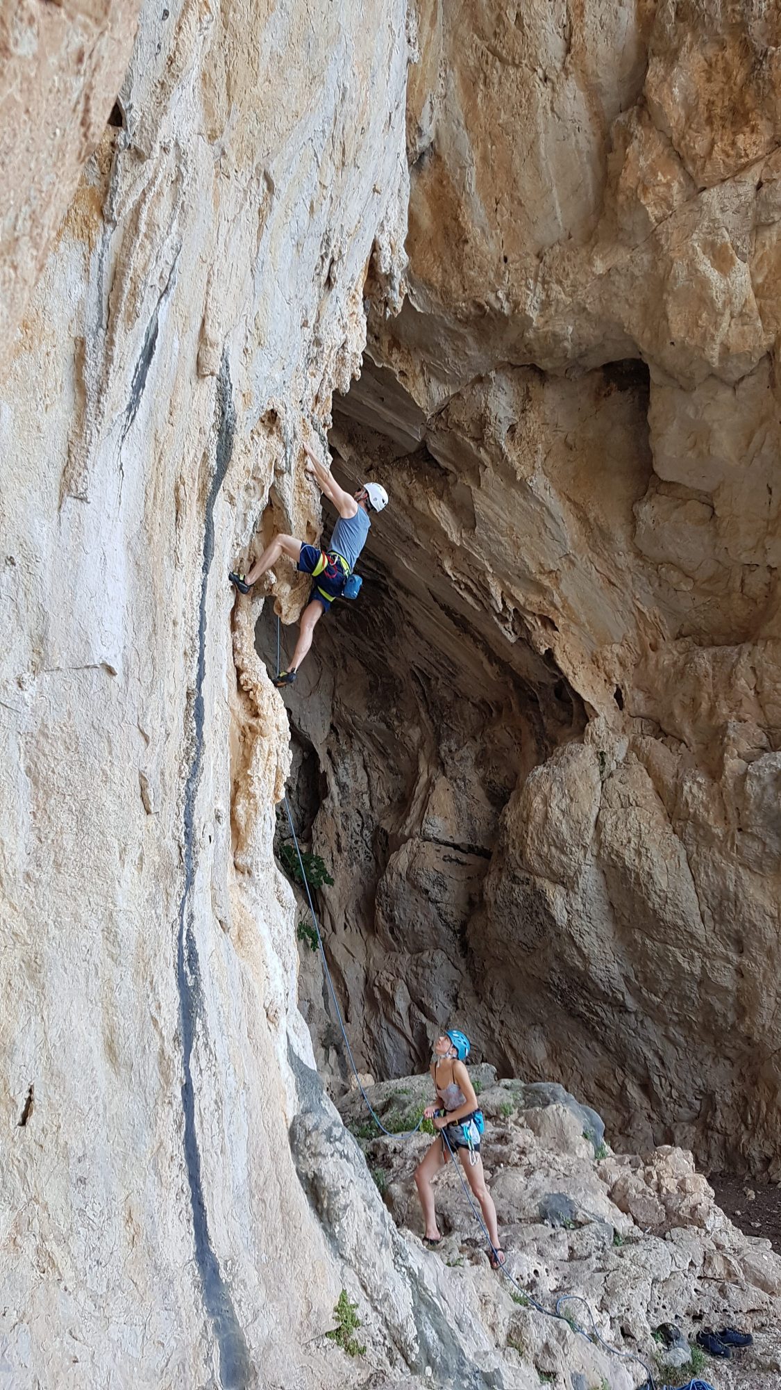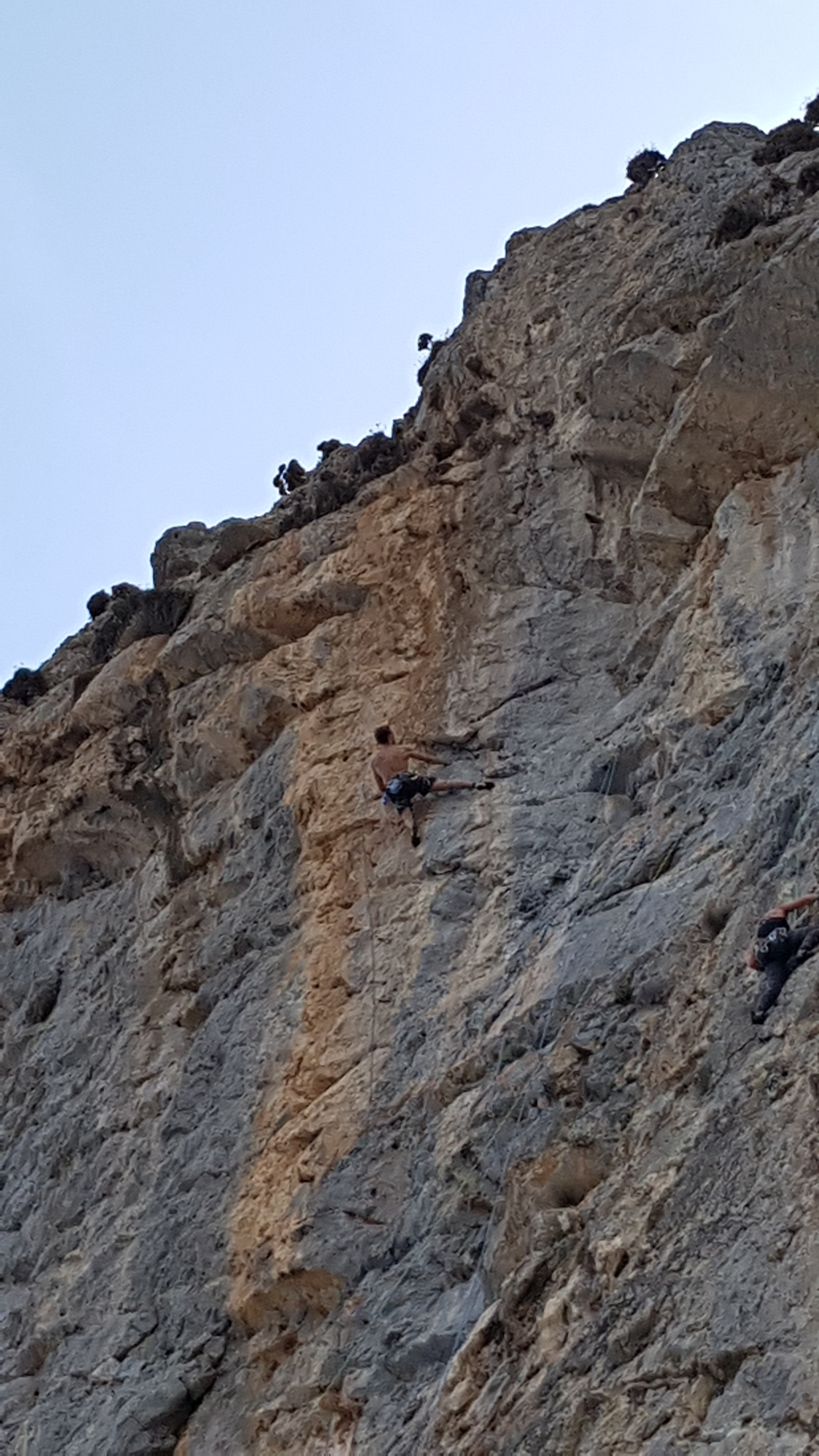 Der erste (halb) offizielle Klettertag war dann der Samstag, wo wir uns nachdem der Himmel in Faliraki kurz die Schleusen geöffnet hatte, in zwei Fuhren aufgemacht haben nach Ladiko, einem der größten Klettergebiete auf Rhodos. Dort gab es von einfachen 5a/b Routen bis hin zu schwierigen Sinter-Touren in der Höhle (bis zu 7c) gleich die volle Bandbreite, sodass für jeden was dabei war.