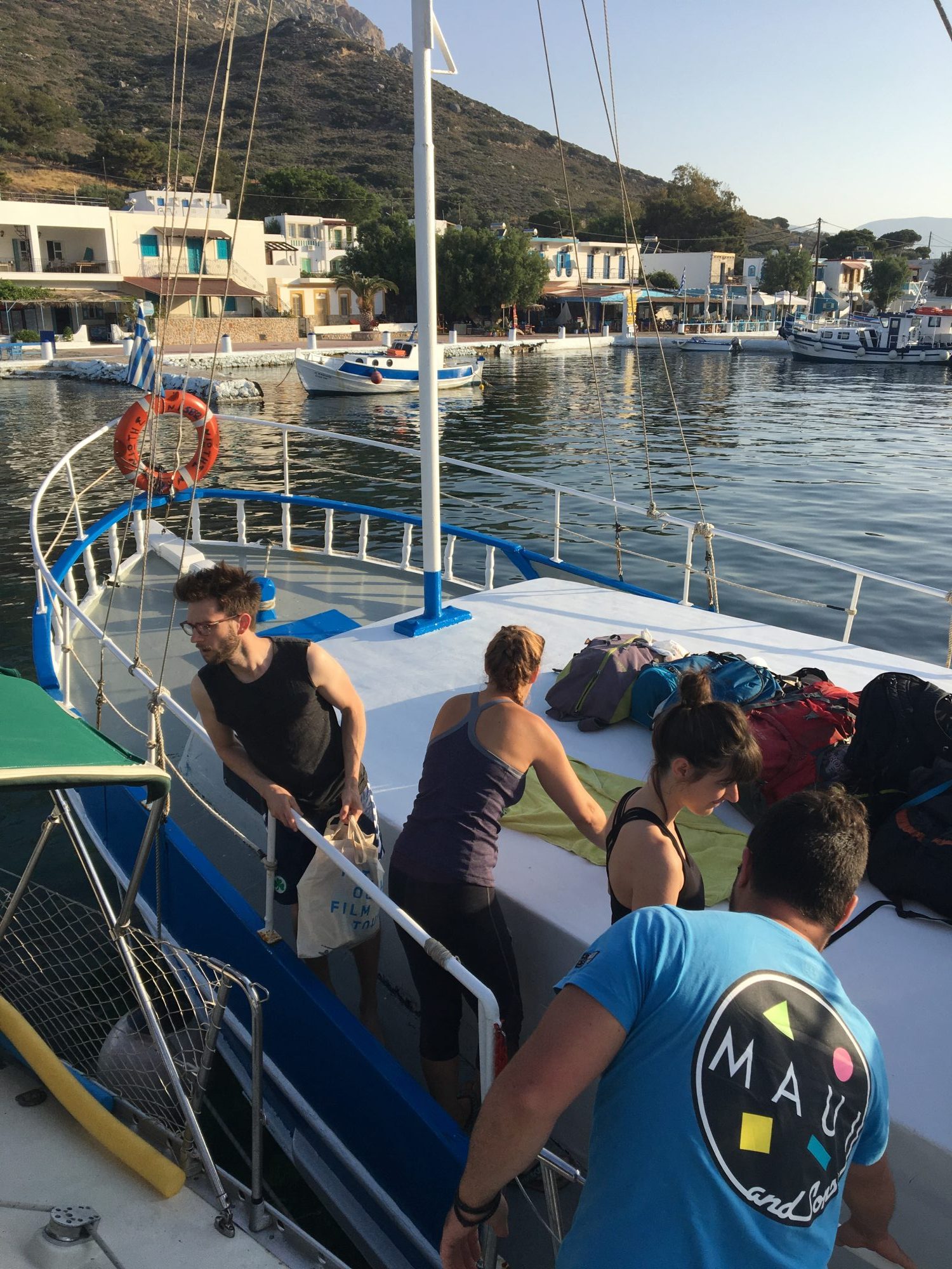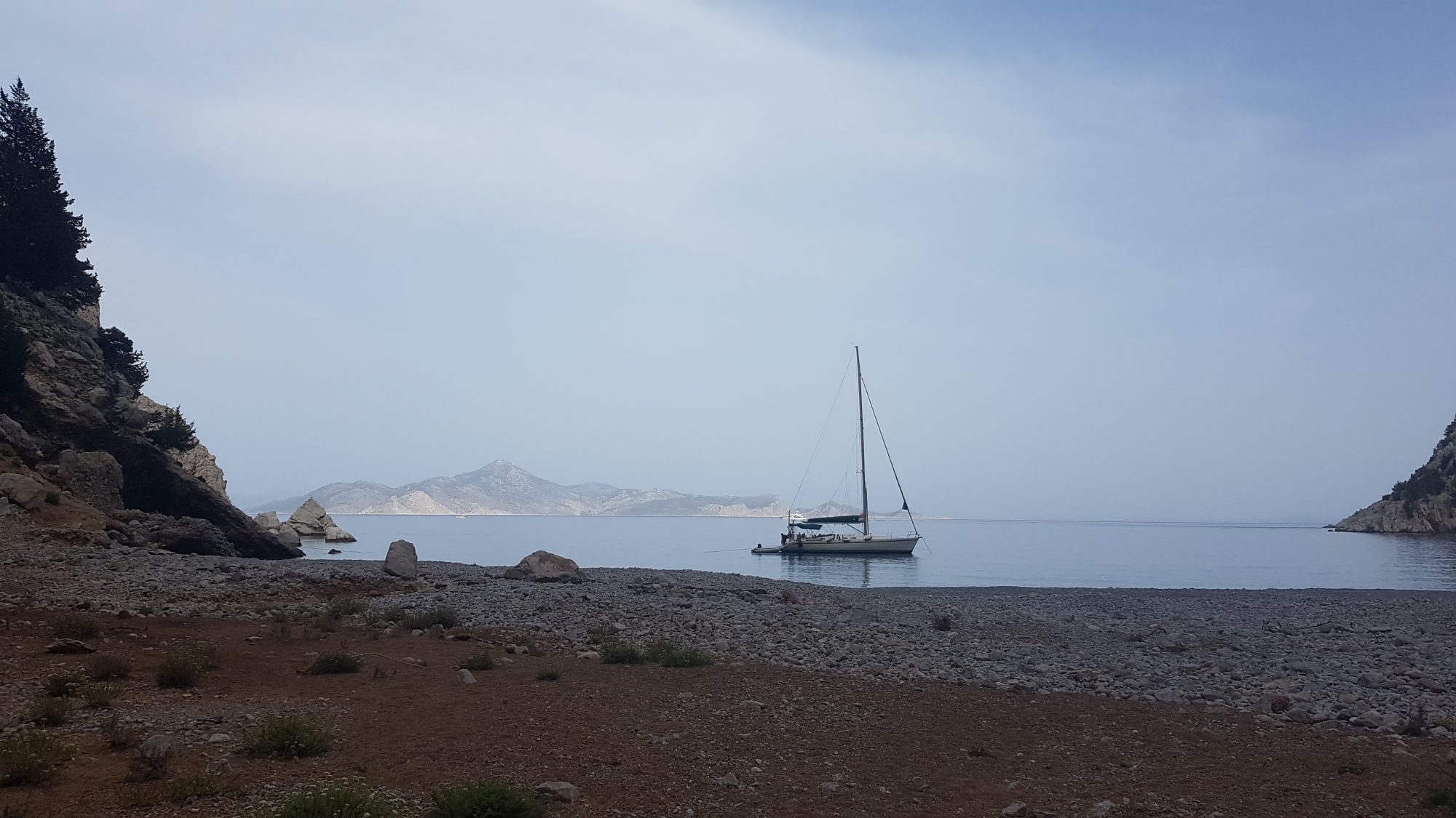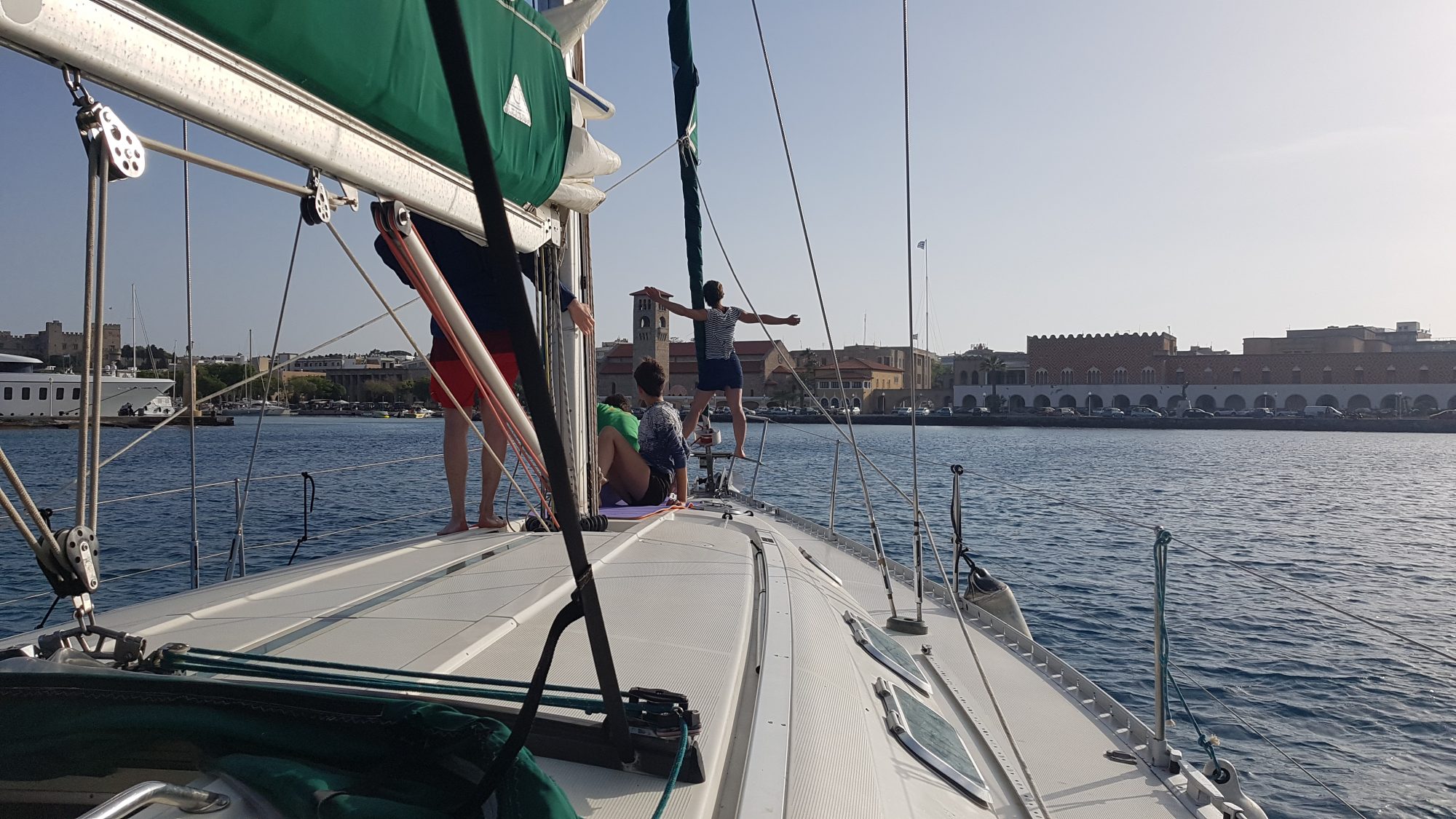 Am Sonntag Morgen ging es dann mit einem genüsslichen Frühstück und Bad in der Bucht von Ladiko los. Nachdem alles weggeräumt und verstaut wurde, fuhren alle bis auf Stefanos mit dem Segelboot in den Hafen von Rhodos, wo der Außenboardmotor unseres Dingis noch repariert wurde. Außerdem trafen wir dort wieder auf Stef, der das ganze Kletterzeug vom Vortag im Auto dabei hatte. Das musste natürlich noch aufs Boot verladen werden, bevor es endgültig los gehen konnte. Auf Grund des begrenzten Platzes an Board, wurden kurzerhand die leer geräumten Koffer von Board gebracht. Ob so viel Platz gewonnen wurde, bleibt allerdings unklar 😉