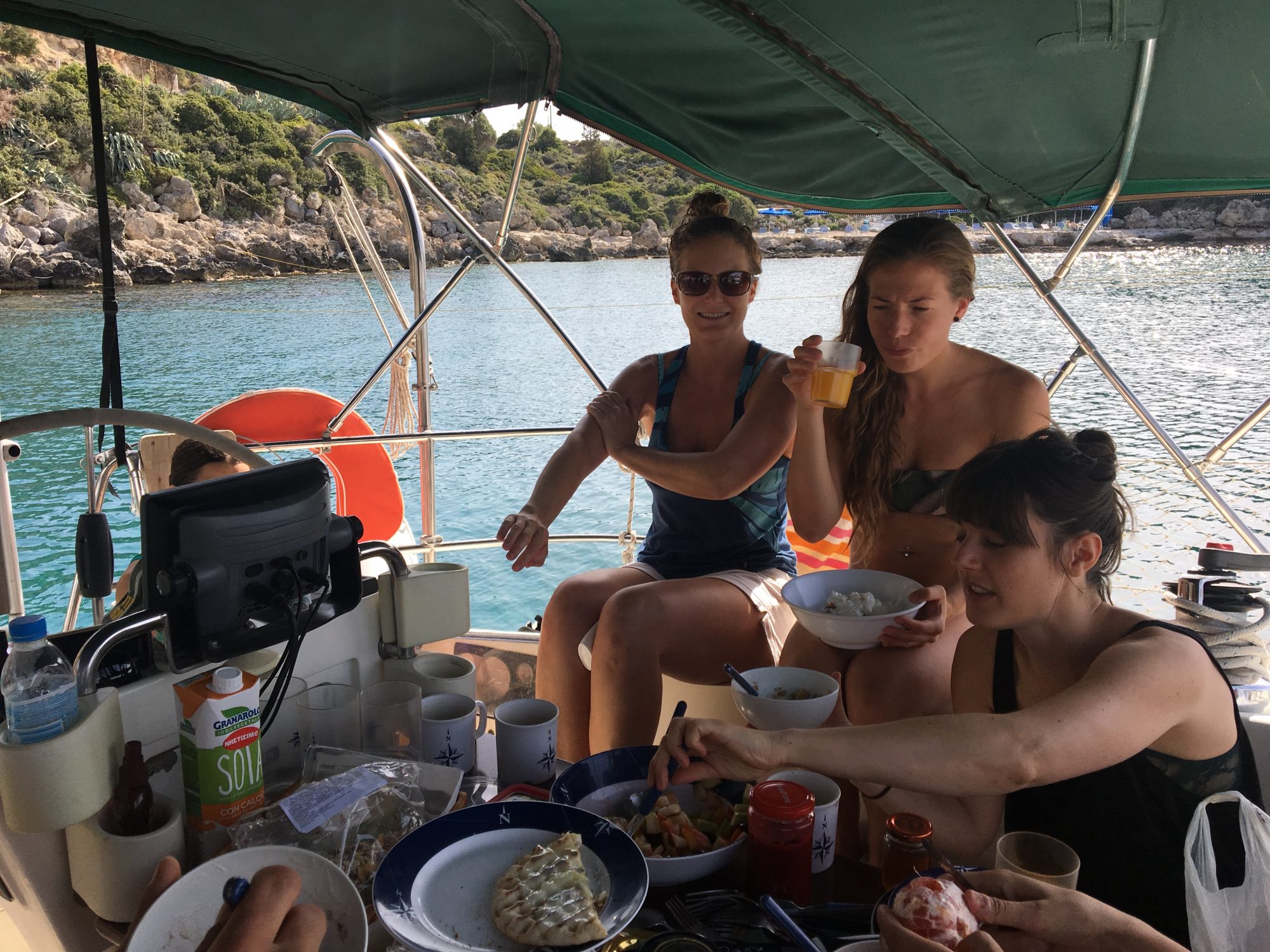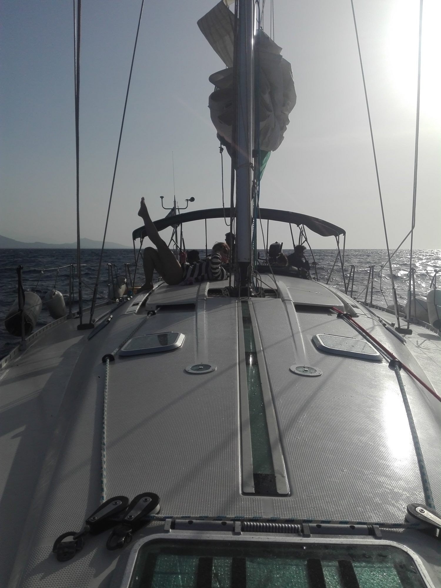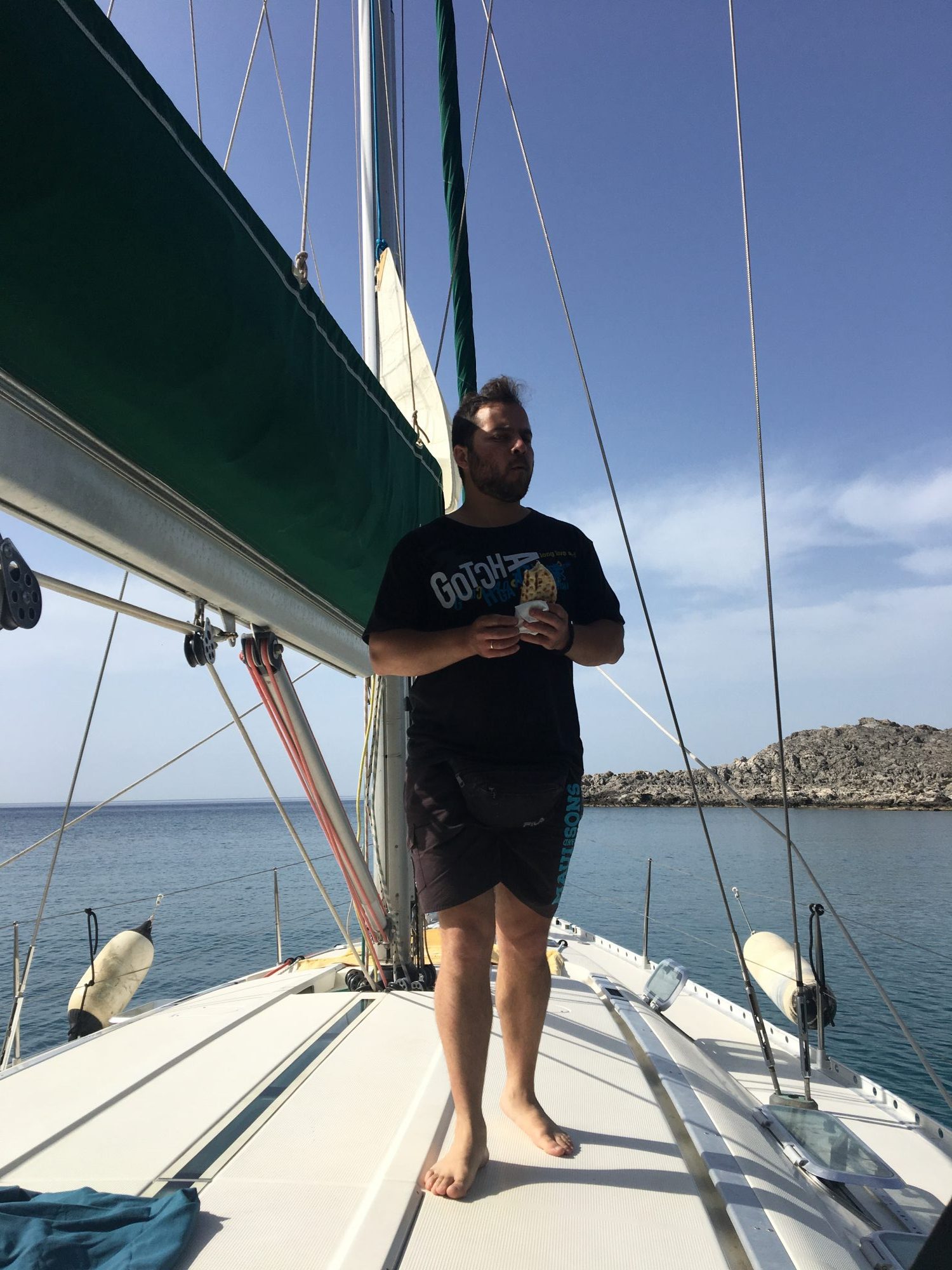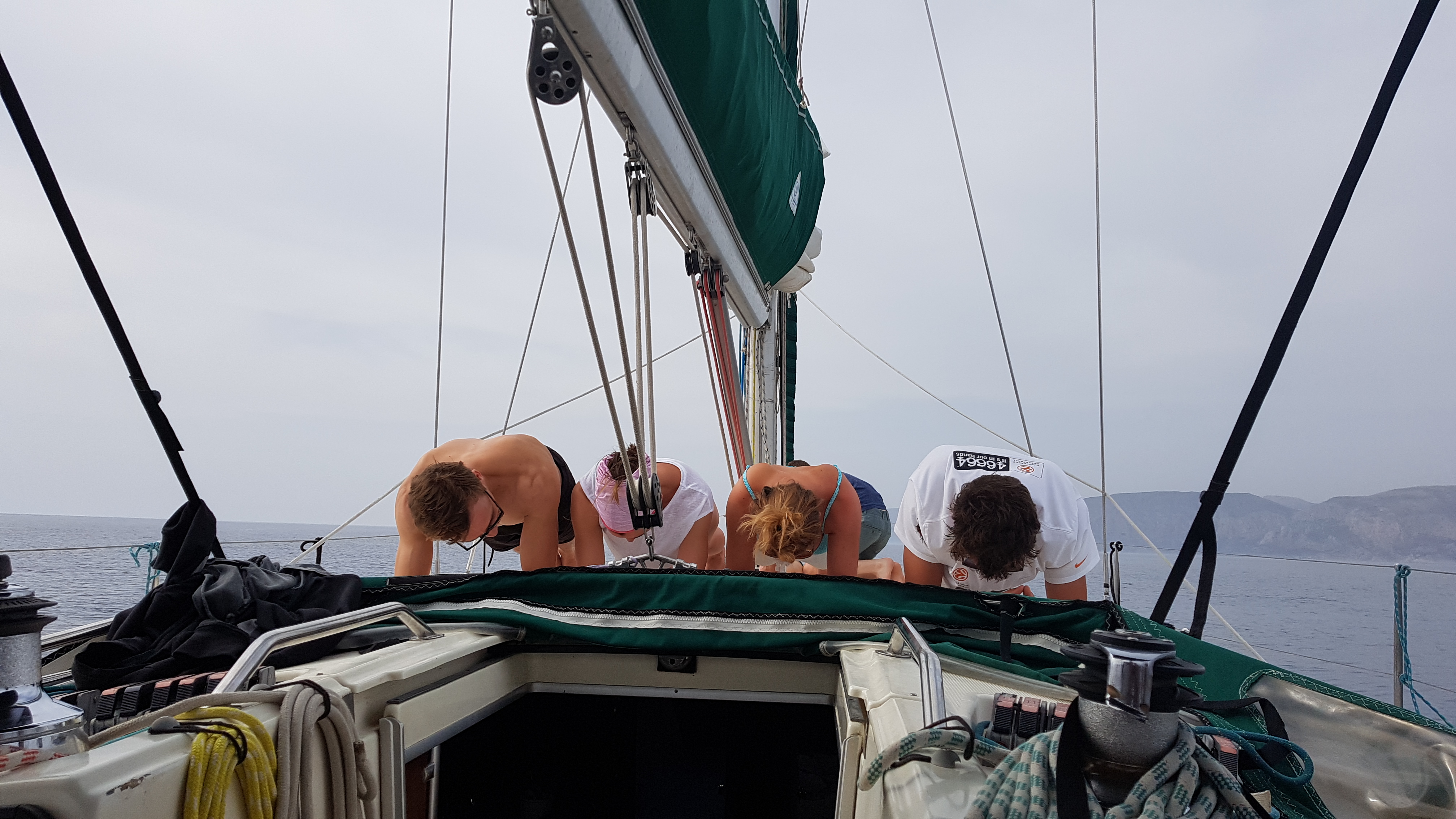 Am Freitag startete unser Kapitän bereits um 03:30 bei heftigem Seegang uns Richtung Rhodos zu segeln. Um ca. 10:30 in Tilos angekommen, durften wir erstmal gemütlich an Deck frühstücken und mehr oder weniger die letzten Reste vernichten. Im Anschluss gab es noch eine kurze Schwimm- und Schnorchelzeit bevor es den langen Weg zurück nach Rhodos ging. Kurz vor der Küste durften wir sogar noch richtig segeln und Savvas bei einigen Wenden helfen. Die Schieflage des Bootes hatten wir bisher noch kaum kennengelernt, da wir meist aus Zeitgründen ungünstig zum Wind mit Motorunterstützung unsere Strecken zurück gelegt hatten. Richtig Spaß hat das gemacht! Und durch die Aufregung war auch kaum jemandem mehr schlecht 😉
