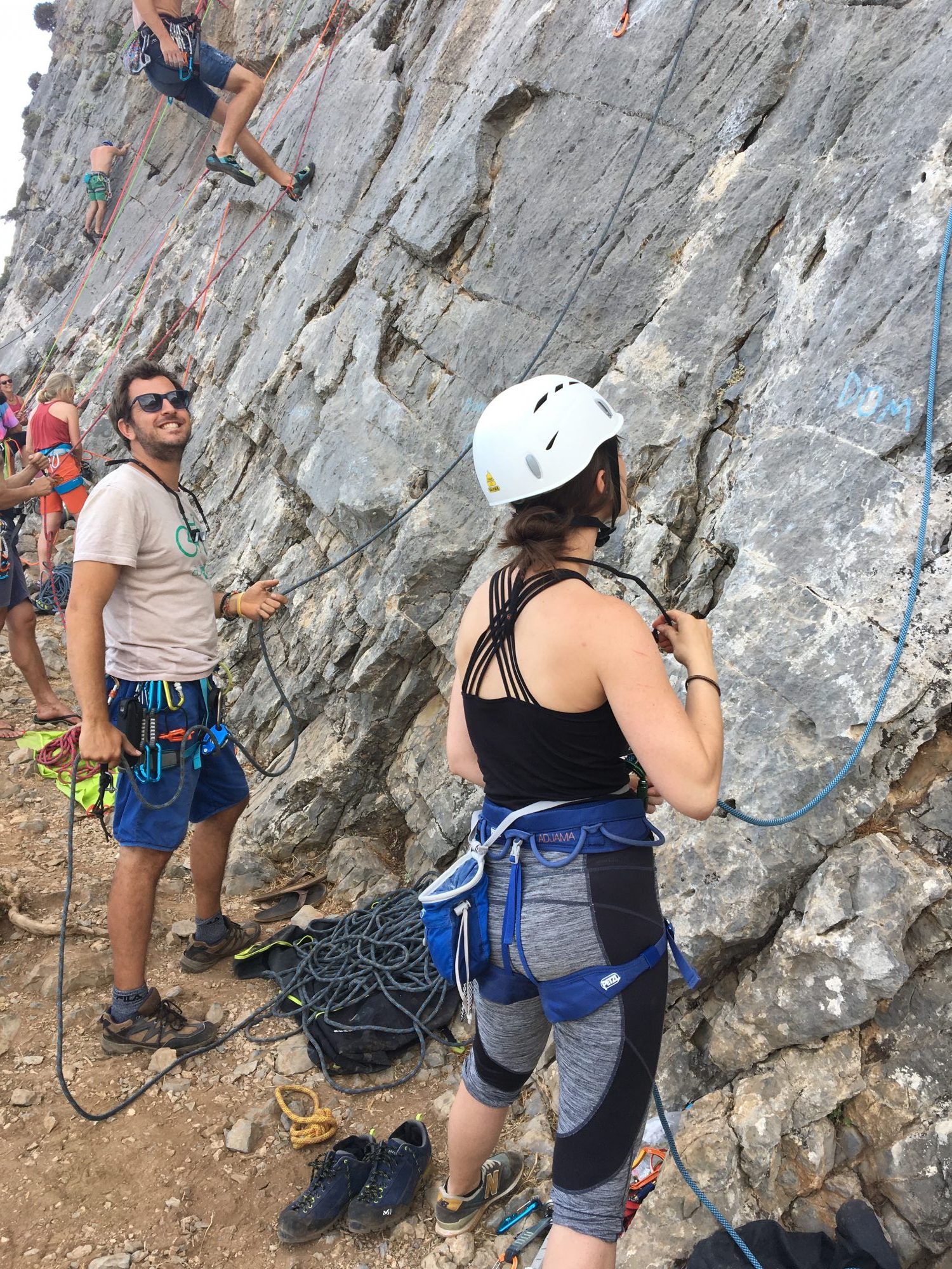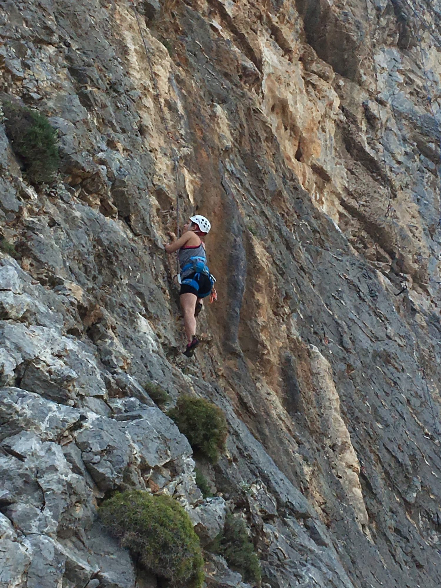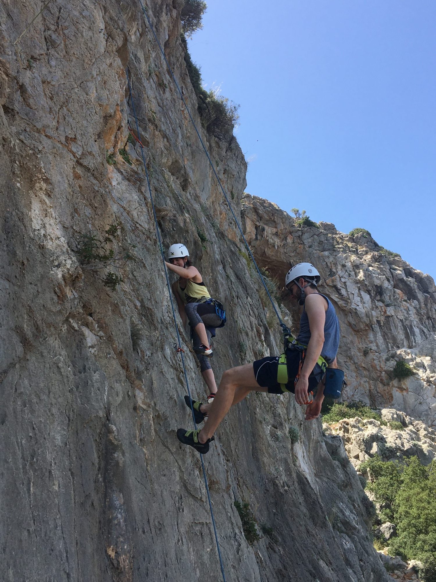 Frisch gestärkt stiegen wir bereits in der Sonne steil auf zu unseren Klettersektoren. Während sich einige gleich nach Panorama und zur Grotte begaben, um die Sinter zu testen, blieb der andere Teil der Gruppe im Sektor Afternoon, um sich meinen Technikübungen auszusetzen 😉 Mit zunächst zwei und dann einer Exe zwischen den Füßen klettern sich die 6as hier doch ganz anders… Dafür haben alle danach mit stark verbesserter Fußtechnik den besten Durchstieg des Urlaubs geschafft! Sich zu überwinden ist so ein tolles Gefühl (wenn man es geschafft hat…)! Nach den letzten Routen im Spartacus, gings auf Kaffee und Jenga zurück ins Monster Café, zur Massage bei Dimitrios, zum Aperitif bei Fatolitis und zu guter Letzt auf ein wohlverdientes griechisches Festmal zu Taverna Miltos. Am Schluss hat sich sogar noch der verloren geglaubte Clipstick wieder gefunden. Französische Kletterer hatten ihn unabsichtlich eingepackt und uns durch Zufall auf der Straße in Masouri wieder getroffen und ihn uns zurück gegeben. Hoch lebe die Ehrlichkeit 🙂