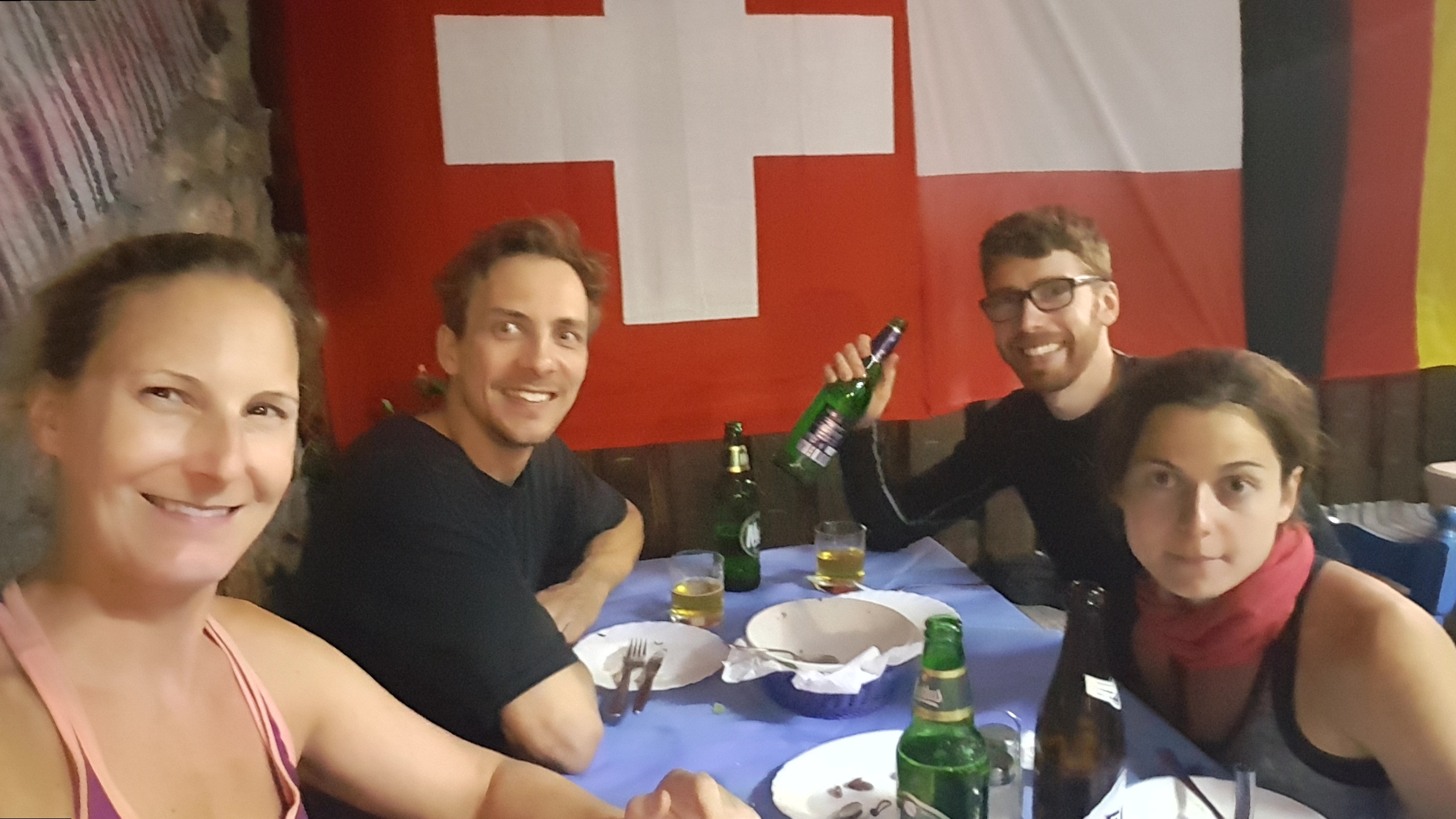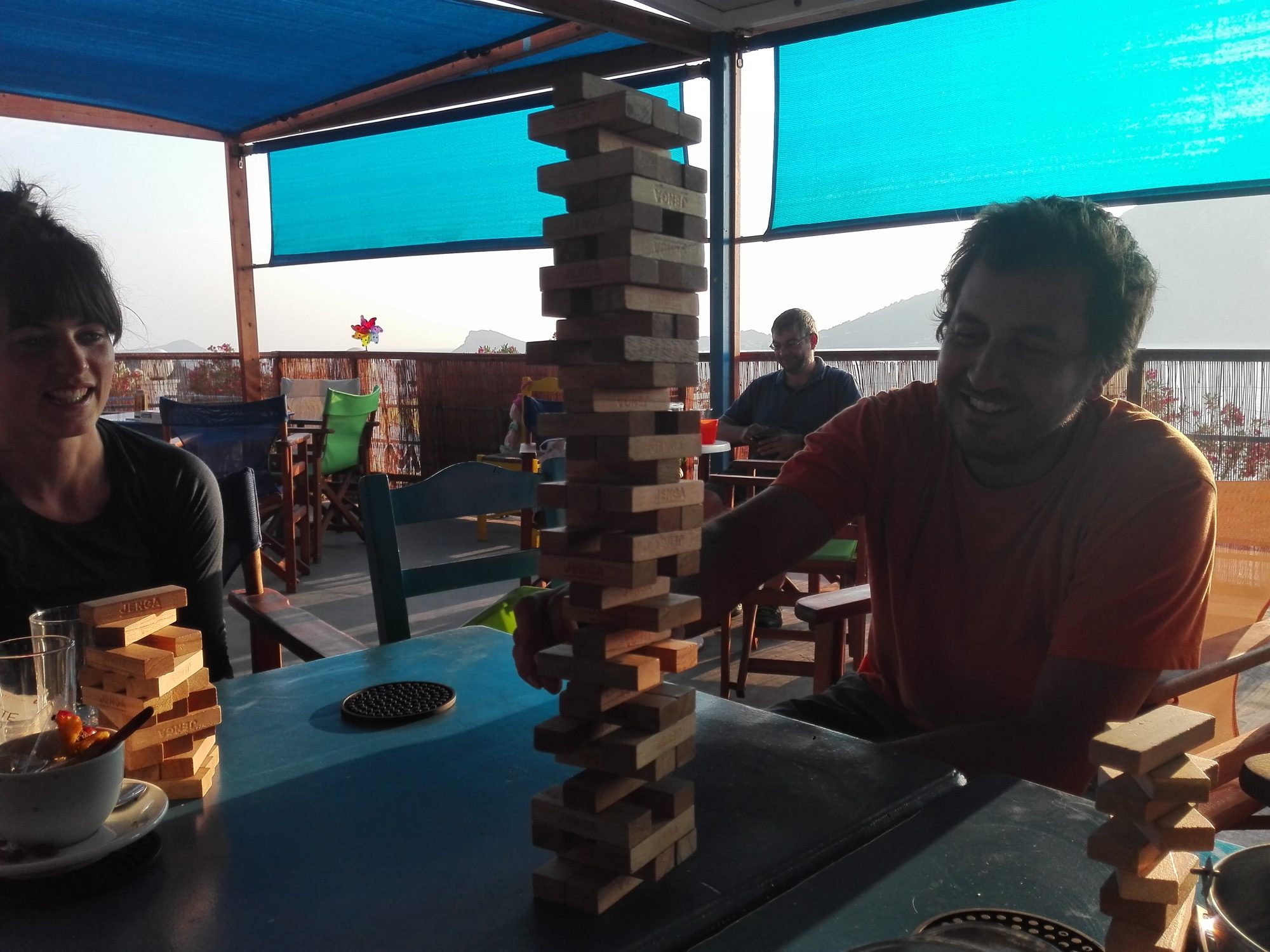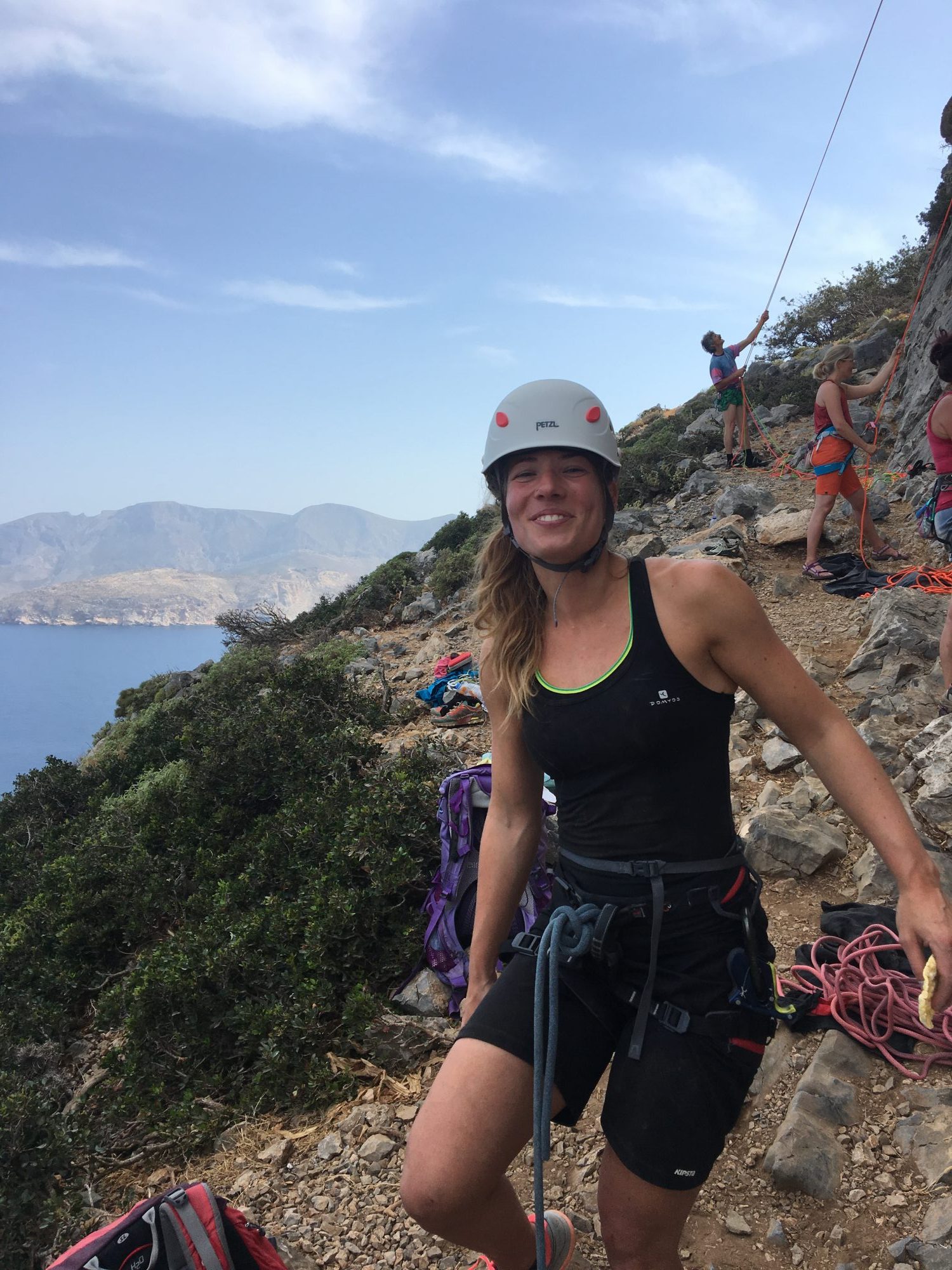 Frisch gestärkt stiegen wir bereits in der Sonne steil auf zu unseren Klettersektoren. Während sich einige gleich nach Panorama und zur Grotte begaben, um die Sinter zu testen, blieb der andere Teil der Gruppe im Sektor Afternoon, um sich meinen Technikübungen auszusetzen 😉 Mit zunächst zwei und dann einer Exe zwischen den Füßen klettern sich die 6as hier doch ganz anders… Dafür haben alle danach mit stark verbesserter Fußtechnik den besten Durchstieg des Urlaubs geschafft! Sich zu überwinden ist so ein tolles Gefühl (wenn man es geschafft hat…)! Nach den letzten Routen im Spartacus, gings auf Kaffee und Jenga zurück ins Monster Café, zur Massage bei Dimitrios, zum Aperitif bei Fatolitis und zu guter Letzt auf ein wohlverdientes griechisches Festmal zu Taverna Miltos. Am Schluss hat sich sogar noch der verloren geglaubte Clipstick wieder gefunden. Französische Kletterer hatten ihn unabsichtlich eingepackt und uns durch Zufall auf der Straße in Masouri wieder getroffen und ihn uns zurück gegeben. Hoch lebe die Ehrlichkeit 🙂