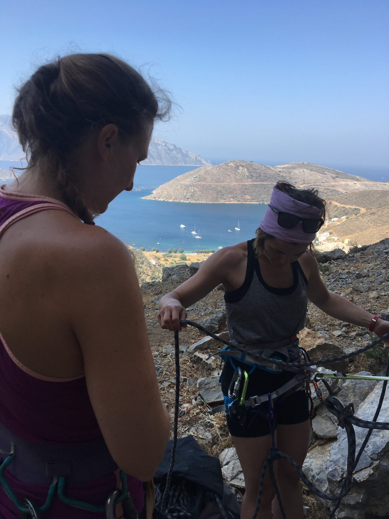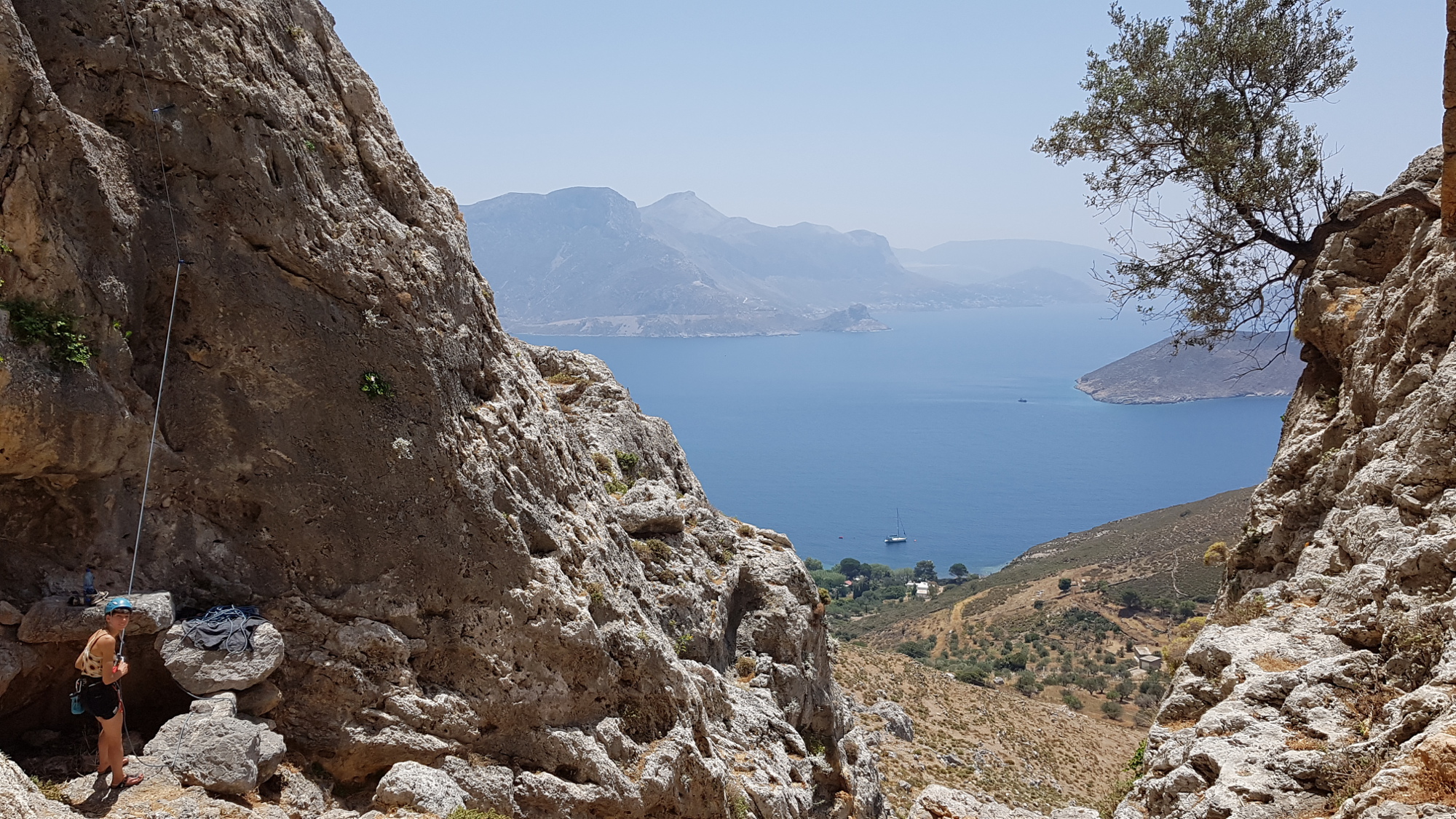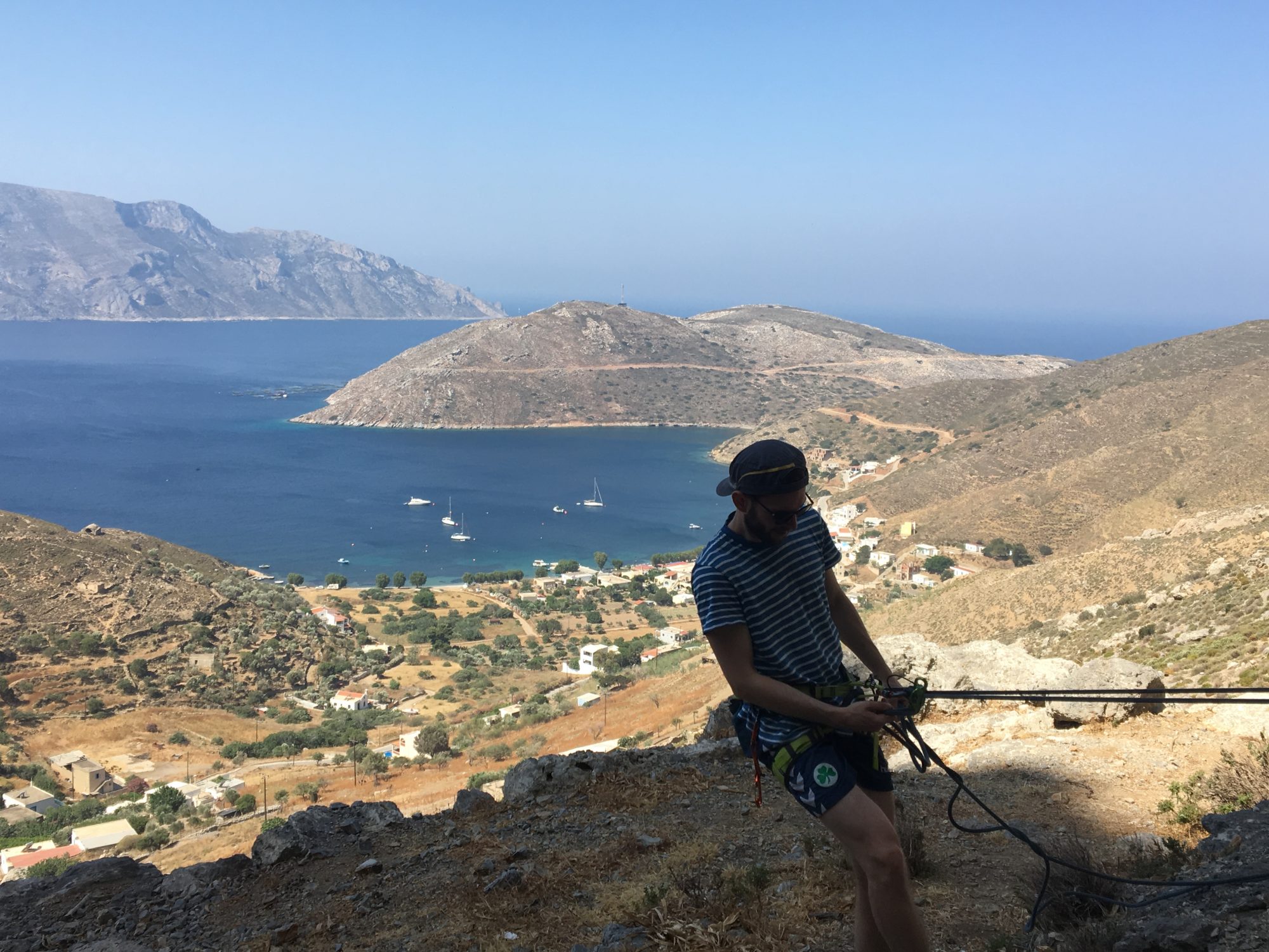 Am Mittwoch fuhren wir in die Bucht von Kalamies, besser bekannt unter „Pirate Bay“. Nach einem ausgiebigen und etwas längeren Frühstück fuhr uns unser Kaptain mit dem Dingi an Land und wir machten uns auf den mittlerweile sehr sonnigen Weg zum Sektor Kastri (siehe Kalymnos Guidebook). Den Aufstieg hinter uns gebracht, warfen sich die einen gleich in die grandiosen Routen von 5a bis 7b+, die anderen bekamen eine kleine Unterrichtseinheit zum Thema Abseilen. Das wurde zuerst natürlich am Boden, dann in geringer Höhe und zum Schluss in einer ganzen Kletterroute geübt.