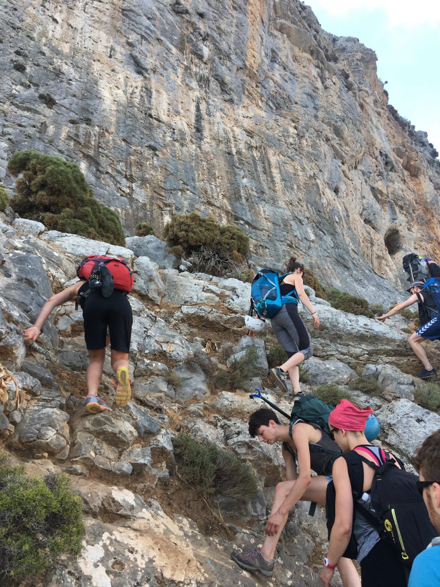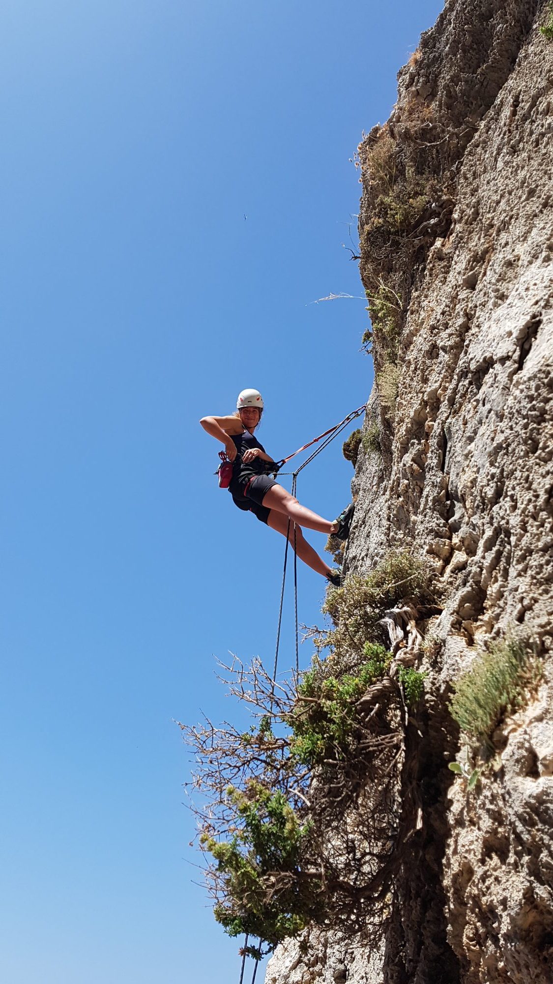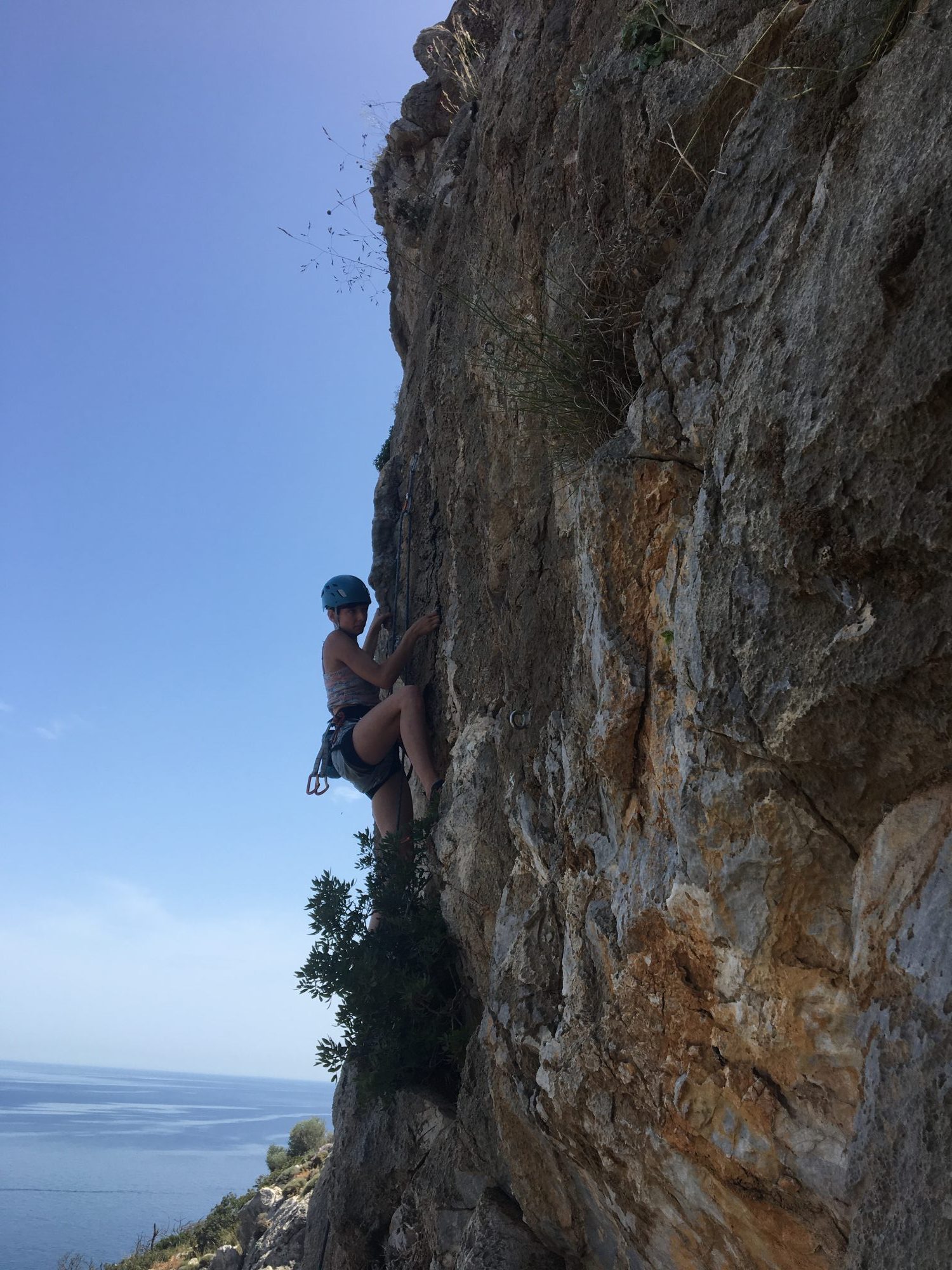 Am Mittwoch fuhren wir in die Bucht von Kalamies, besser bekannt unter „Pirate Bay“. Nach einem ausgiebigen und etwas längeren Frühstück fuhr uns unser Kaptain mit dem Dingi an Land und wir machten uns auf den mittlerweile sehr sonnigen Weg zum Sektor Kastri (siehe Kalymnos Guidebook). Den Aufstieg hinter uns gebracht, warfen sich die einen gleich in die grandiosen Routen von 5a bis 7b+, die anderen bekamen eine kleine Unterrichtseinheit zum Thema Abseilen. Das wurde zuerst natürlich am Boden, dann in geringer Höhe und zum Schluss in einer ganzen Kletterroute geübt.