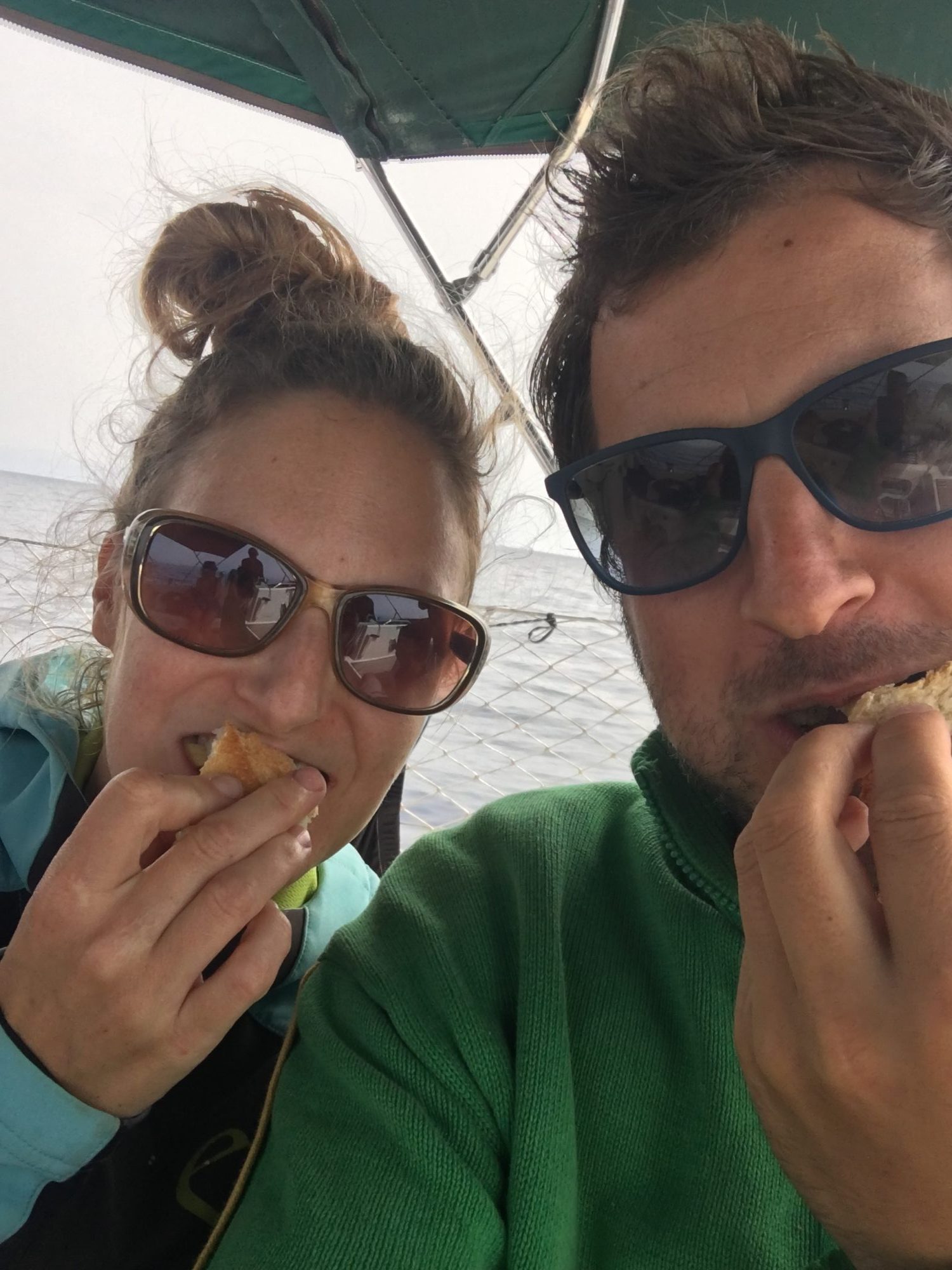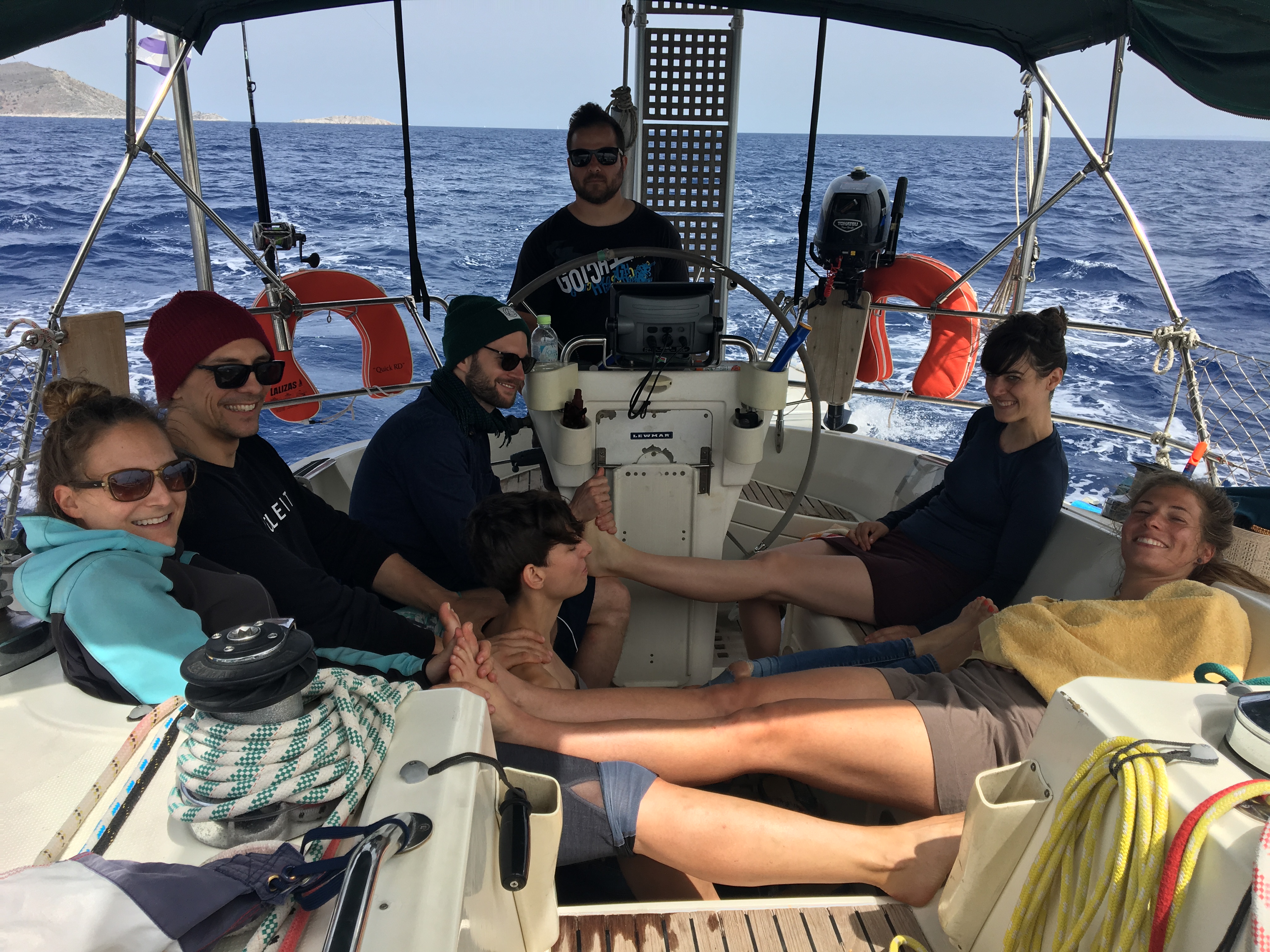Montag war unser erste langer Segeltag von Symi über Tilos nach Kalymnos. Wir bzw. unser lieber Kapitän segelt kurz nach der Dämmerung von Symi los und ging ein paar Stunden später in Tilos vor Anker. Dort krochen dann auch die Langschläfer bzw. diejenigen, denen unten in den Kabinen noch nicht schlecht wurde, an Deck und wir bereiteten gemeinsam ein leckeres Frühstück mit 3 Pfannen an verschiedenen Rührei bzw. Omlett Varianten – Hauptsache Öl und Feta war dabei 😉 Die nächsten Stunden verbrachten wir meist an Deck und vertrieben uns die Zeit mit unterschiedlichen Aktivitäten: Sonnen, Lesen, Massagen, Yoga, Planking und was uns sonst noch für Blödsinn eingefallen ist!! So eine Schifffahrt die ist lustig, eine Schifffahrt die ist schön 🙂 Ach ja, guten Absatz fanden auch die Reisekaugummis und Tabletten sowie trockenes Brot, obwohl wir wirklich nicht viel Seegang hatten… Naja, Kletter-Landratten offensichtlich 😉