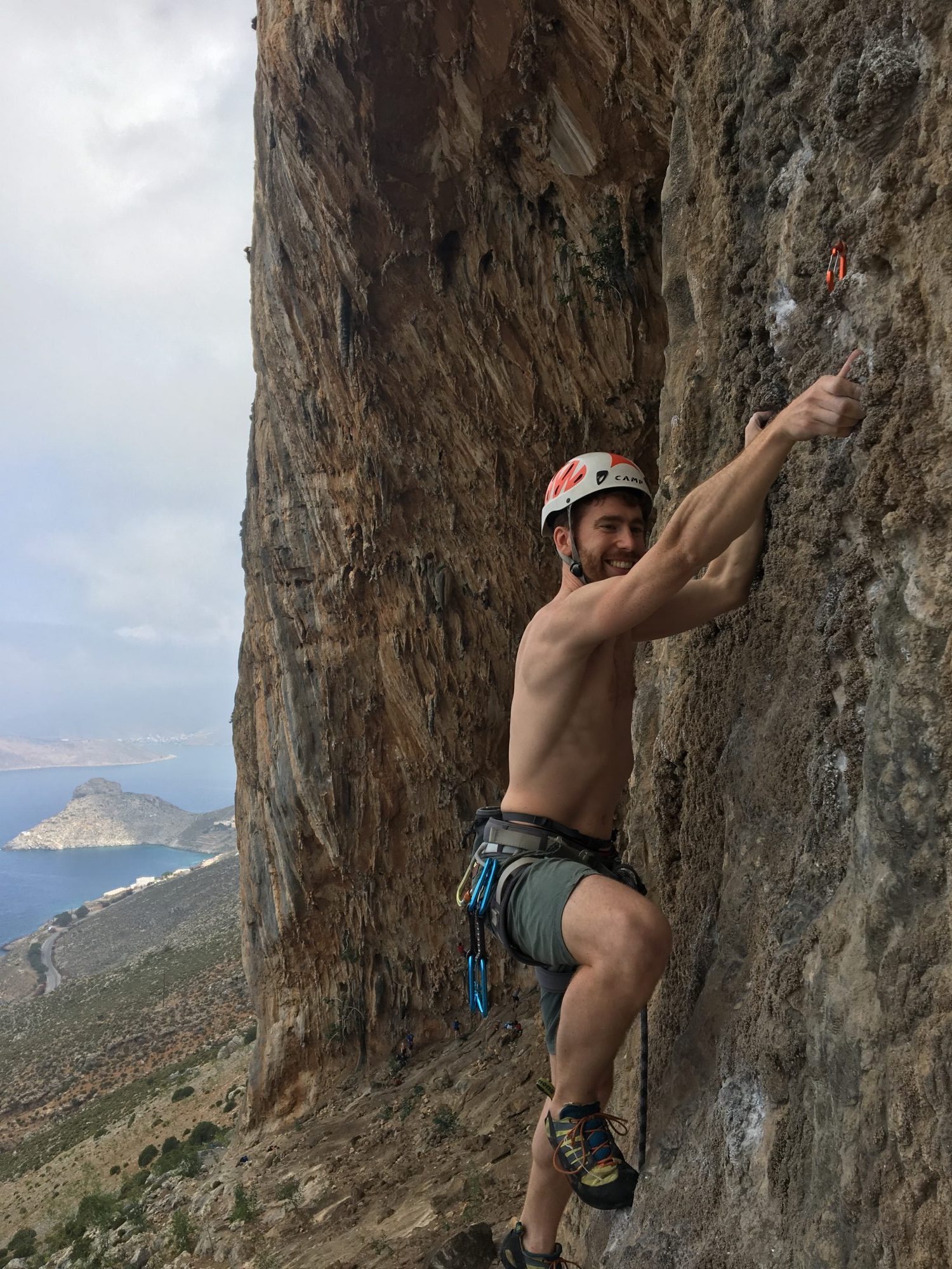 Den Nachmittag verbrachten wir am Pirate Beach, wo Stavros und Manolis uns fürstlich bewirteten (schaut mal auf Kalymnos Pirates – die Familie vermietet auch wunderbare Unterkünfte direkt am Strand!). Ein paar hatten tatsächlich noch nicht genug vom Klettern, also machten wir uns zu viert gegen 17:00 mit dem Dingi zu einer abenteuerlichen Fahrt ans andere Ufer zum Sektor Summertime auf. Genug Benzin zum Abholen gab es nicht mehr, aber wir gingen das Risiko ein – irgendwie kommen wir schon zurück zu unserem Boot… Hofften wir zumindest 😉 Flora & Kevin blieben im unteren Sektor, während Hans und ich versuchten im oberen Sektor – nach einer schönen Einklettertour – eine ganz spezielle Tour zu finden. Das endete mit einer Stunde suchen, einem kurzen verwirrten Versuch bis zum ersten Haken in einer 8b (wie konnten wir nur glauben, dass das die von uns gesuchte 7a sein soll… naja, das Chaos war mit uns), und einer wunderschönen 6c zum Schluss.