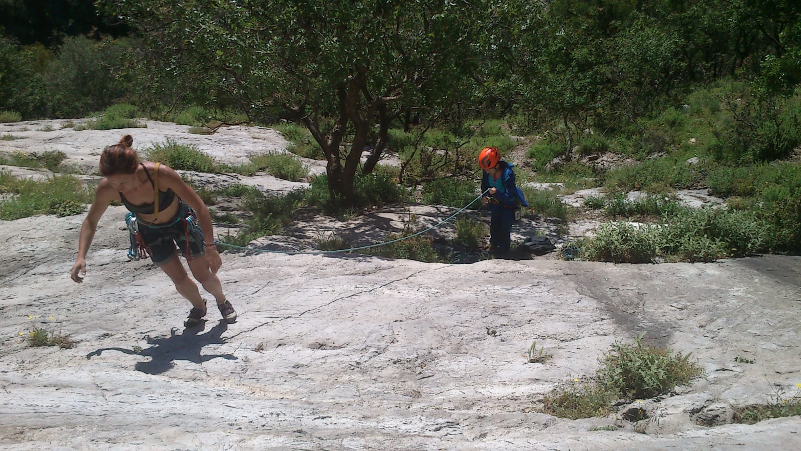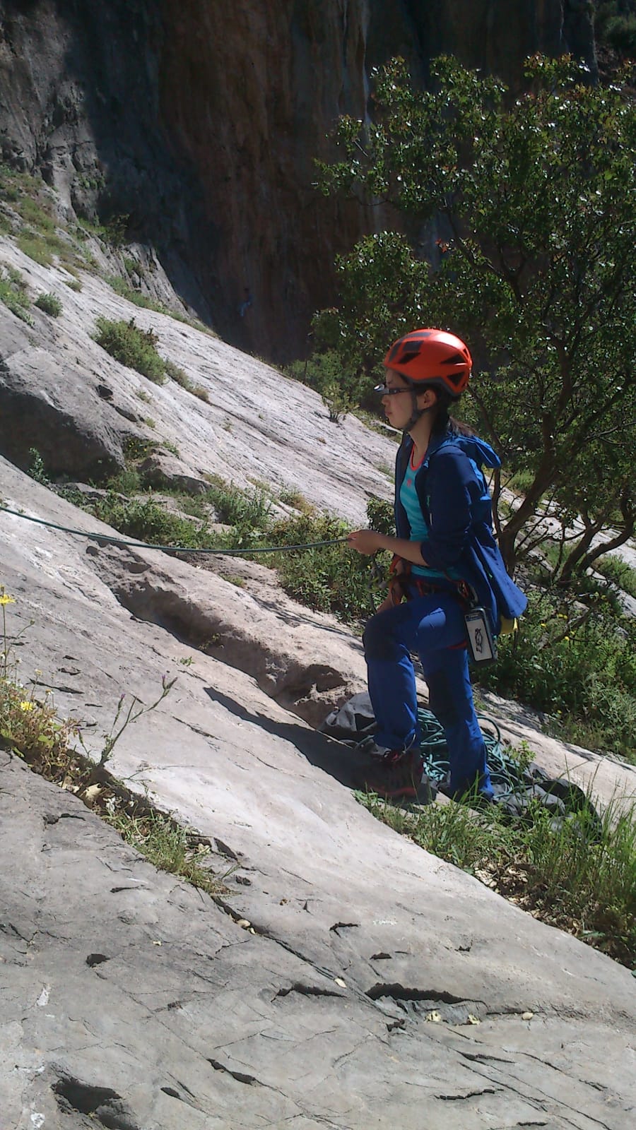Yi wollte unbedingt noch ihre in der Halle erlernten Mehrseillängenkenntnisse anwenden also starteten wir nach einer Trockenübung am Boden in eine „kleine“ Mehrseillänge, genauer gesagt in die „Jacob“ 4 mit Extension. Erfolgreich am zweiten Stand angekommen, brutzelten wir etwas in der Sonne bevor der Spass des Abseilens losgehen konnte.