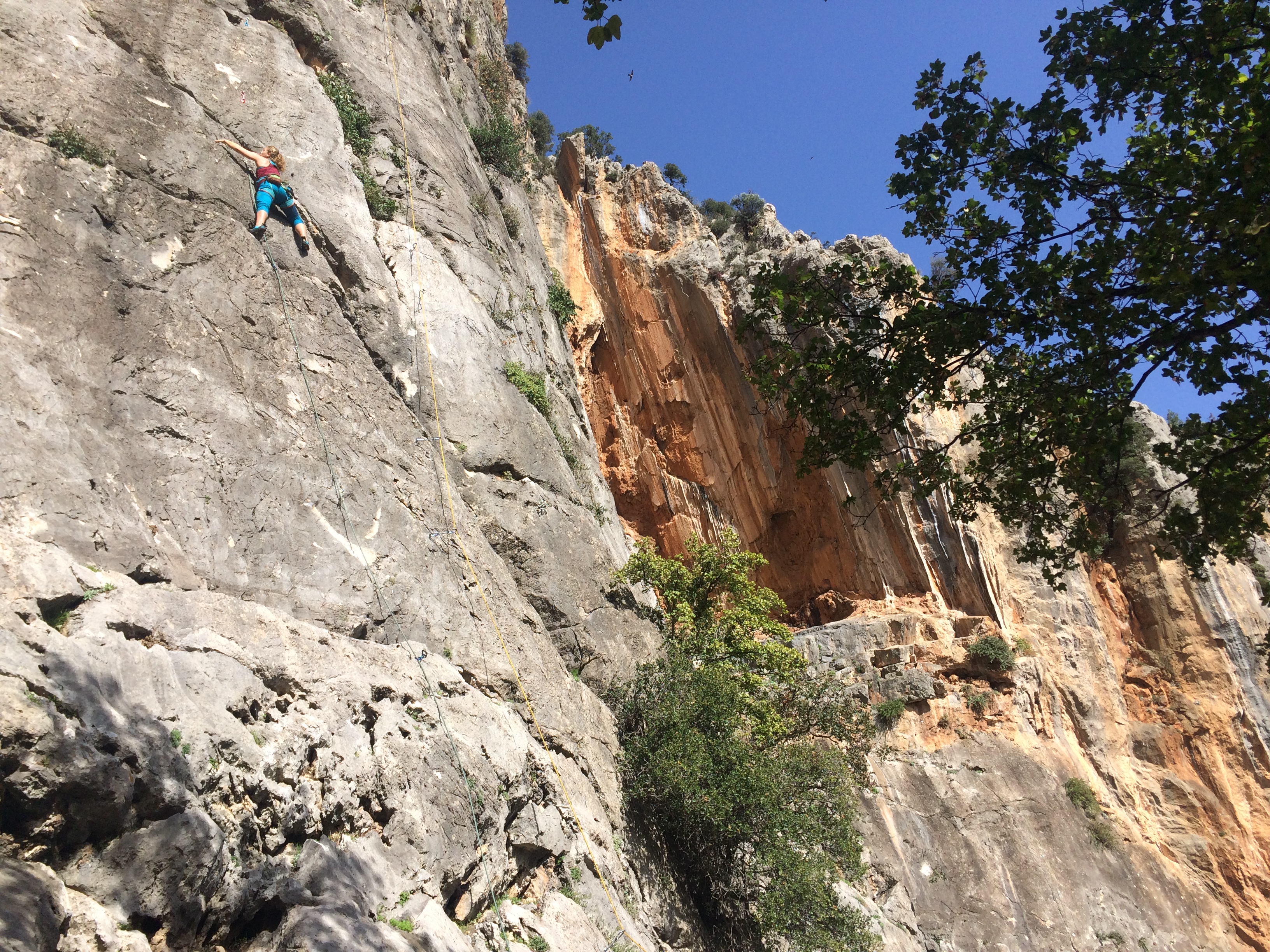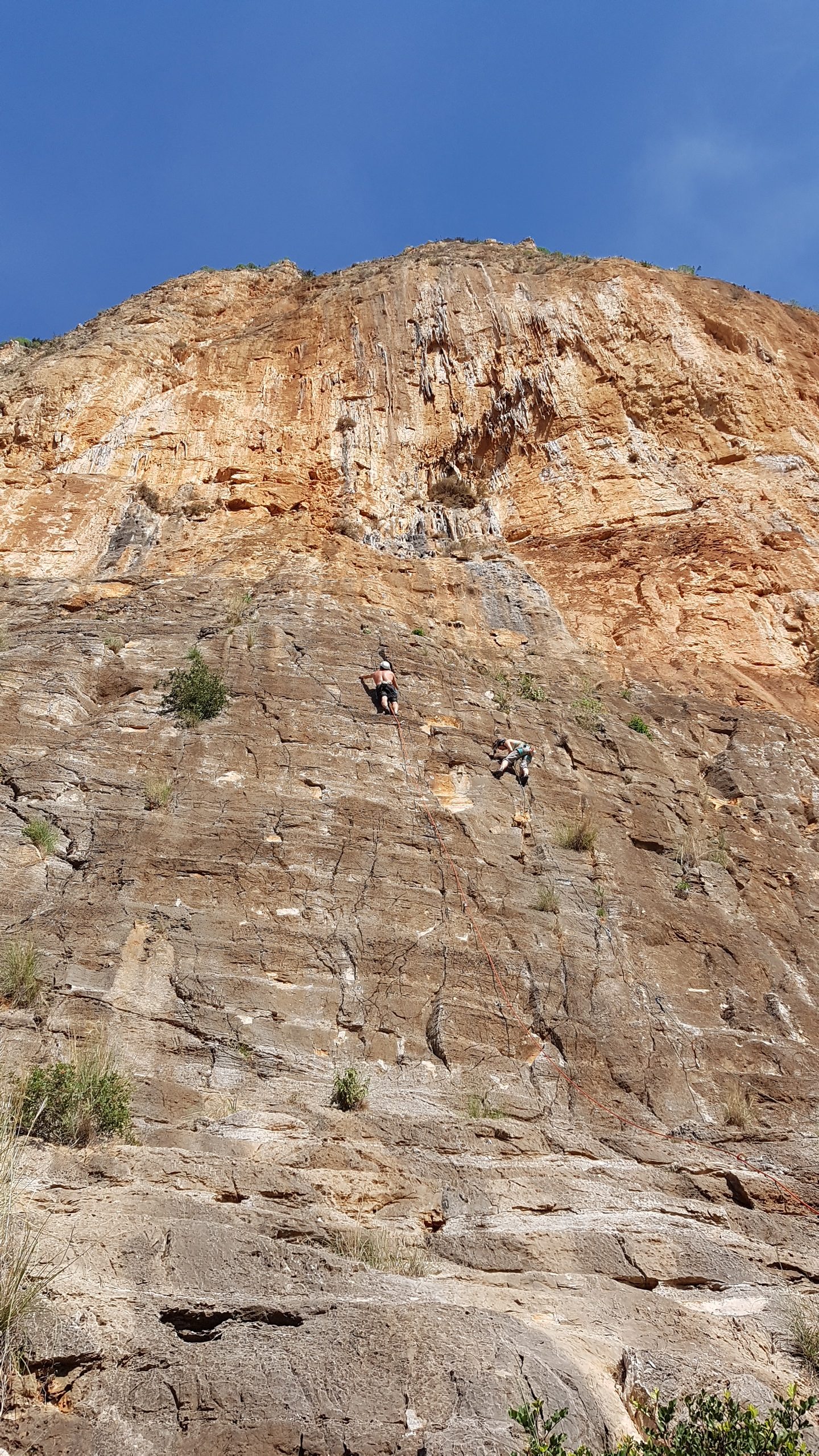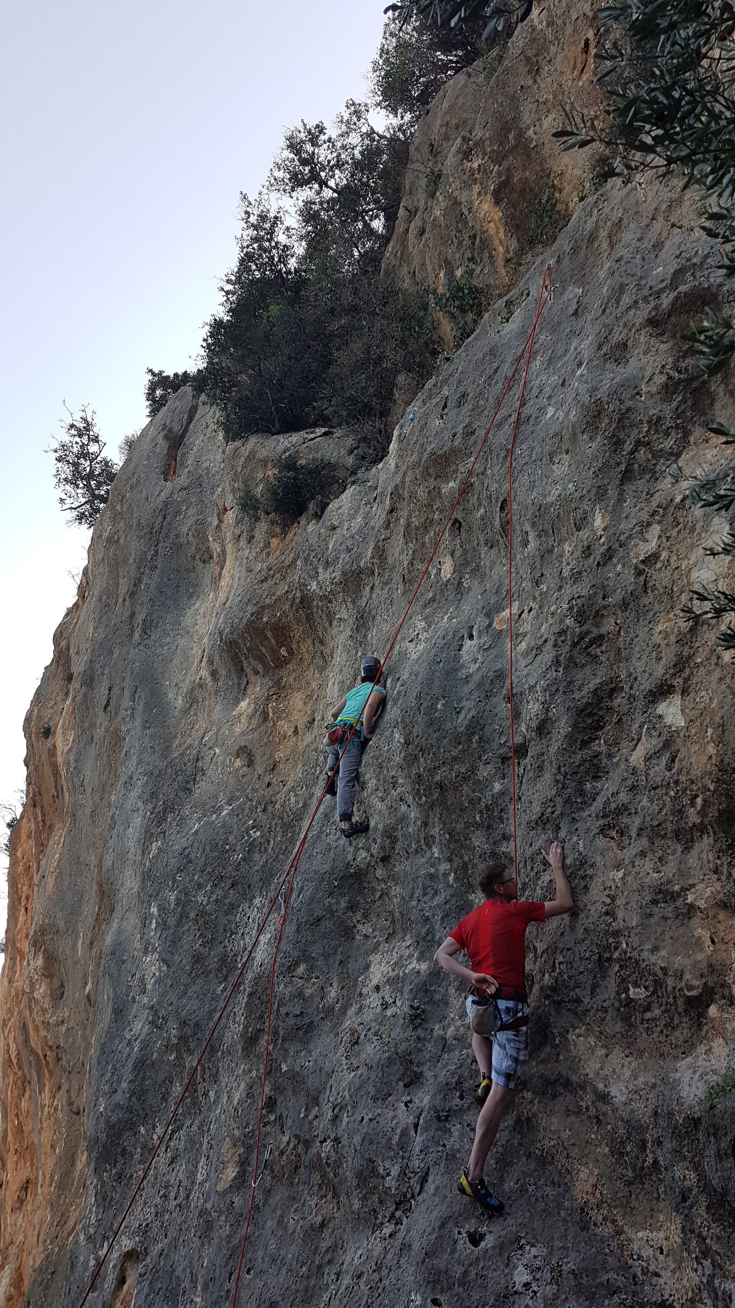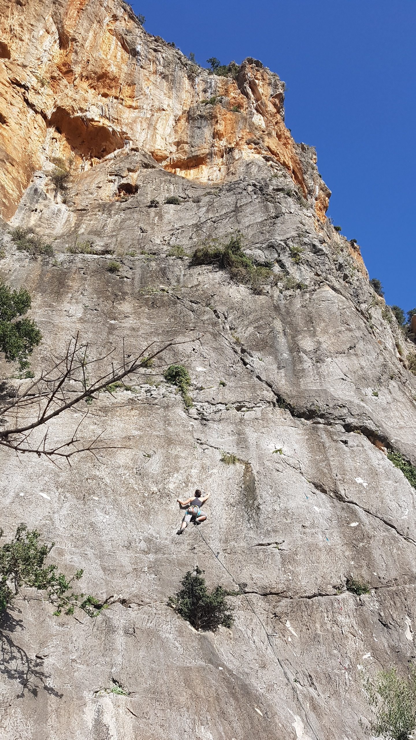 Am zweiten Klettertag ging es hoch hinaus zur Hauptwand Leonidios, dem alles überstrahlenden Riegel „Kokkinovrachos“. Er ist ist viele Untersektoren unterteilt und bietet sowohl ohne Ende Sportkletterrouten, aber auch viele Mehrseillängen, die für uns allerdings diesmal nicht von Interesse waren.
