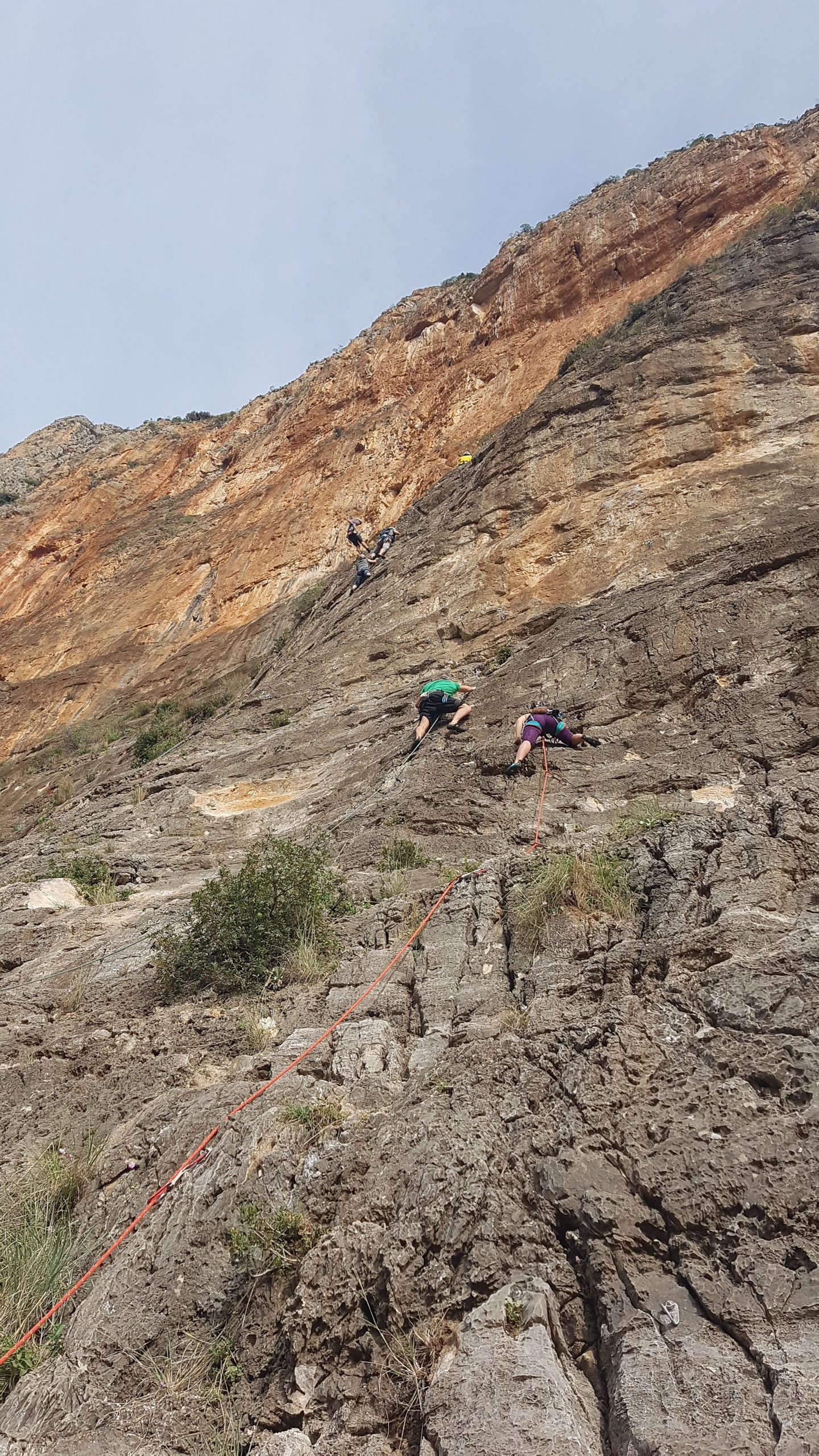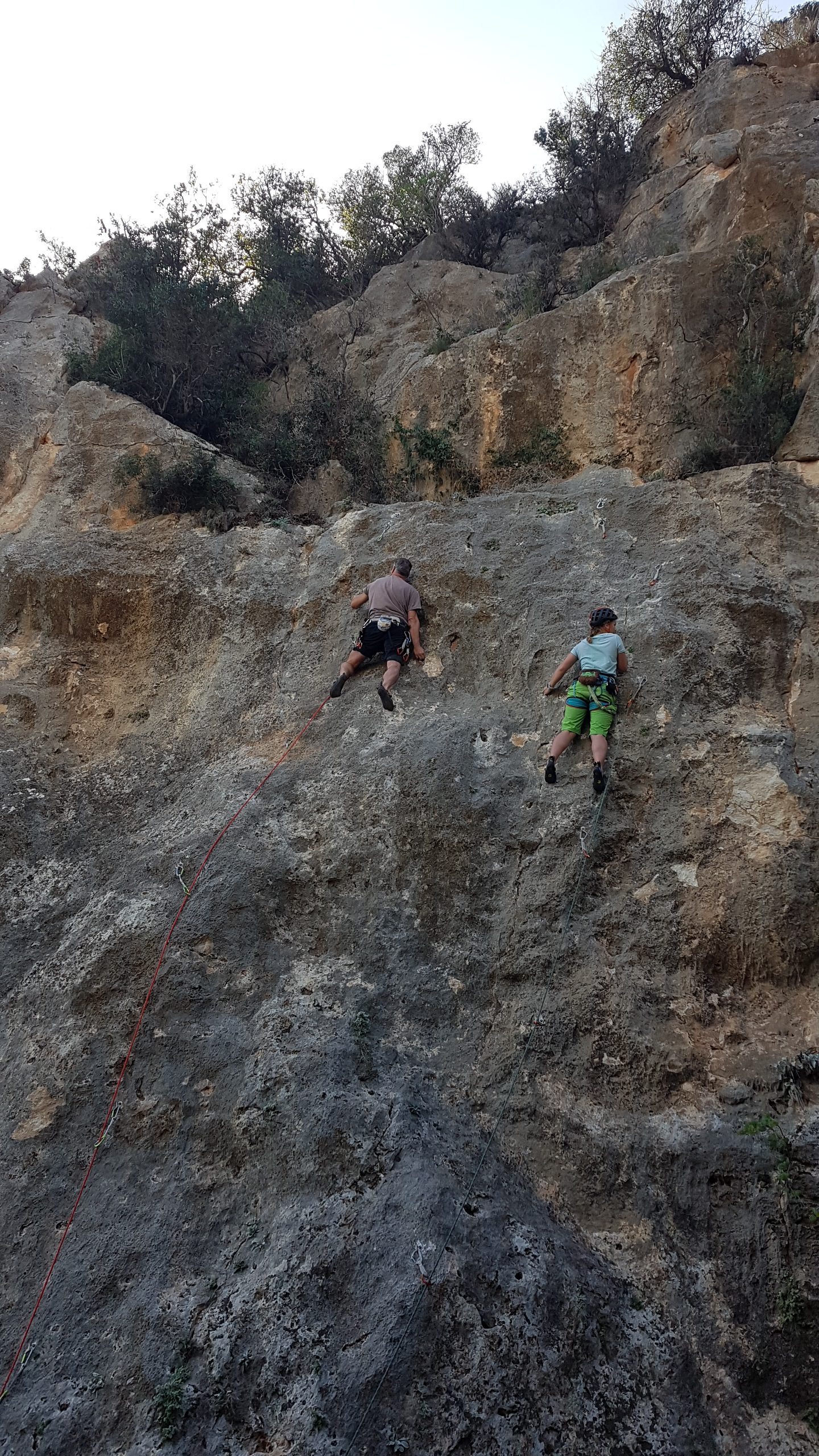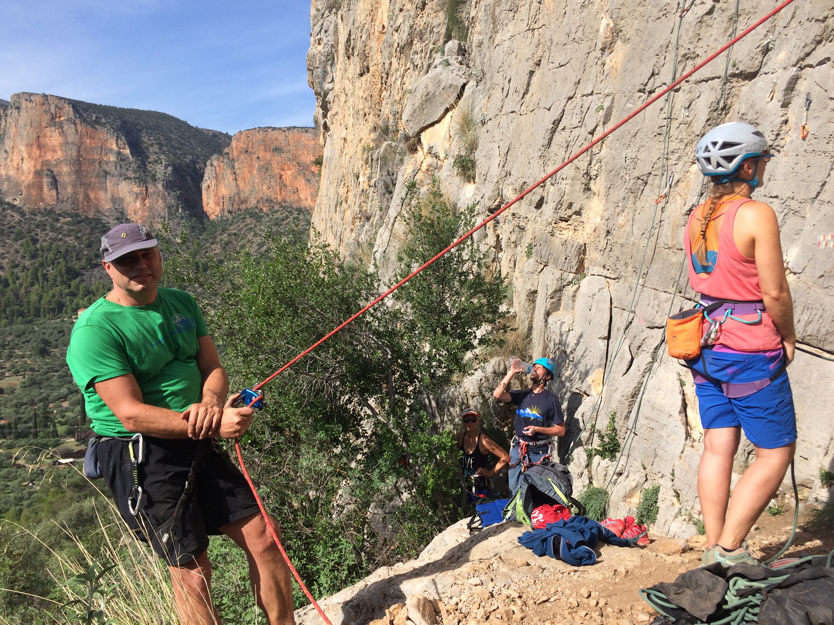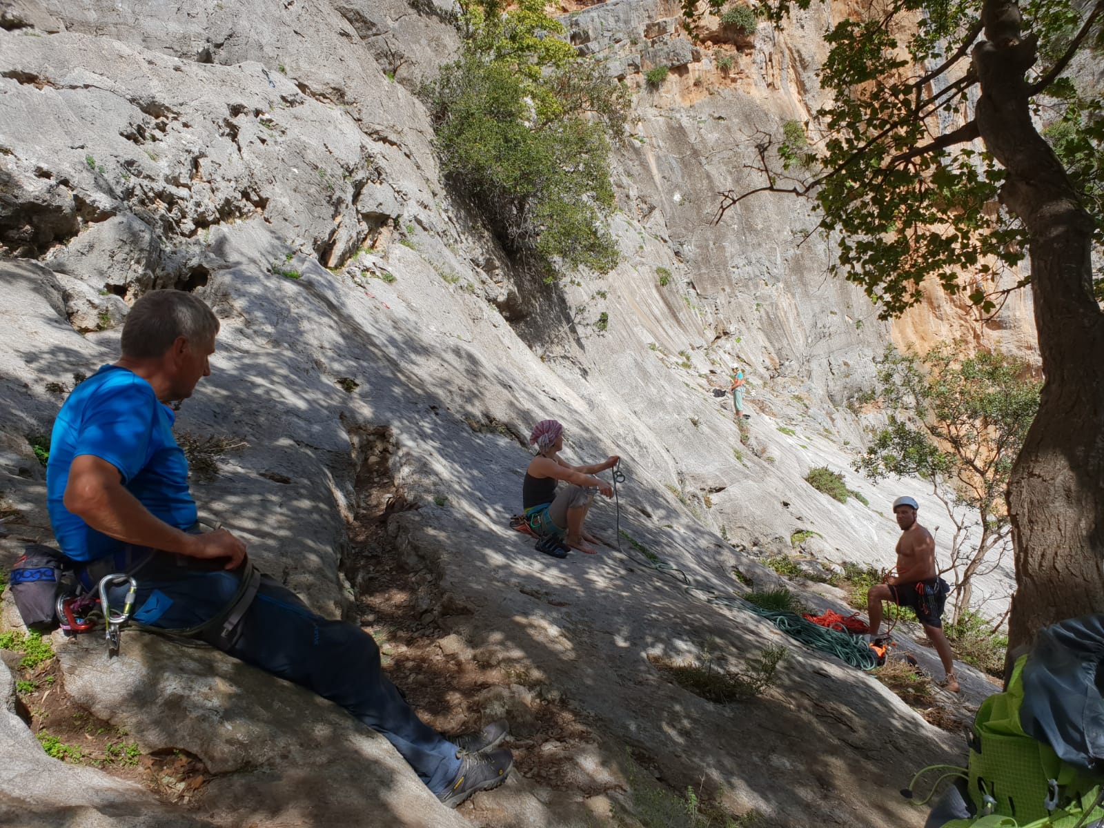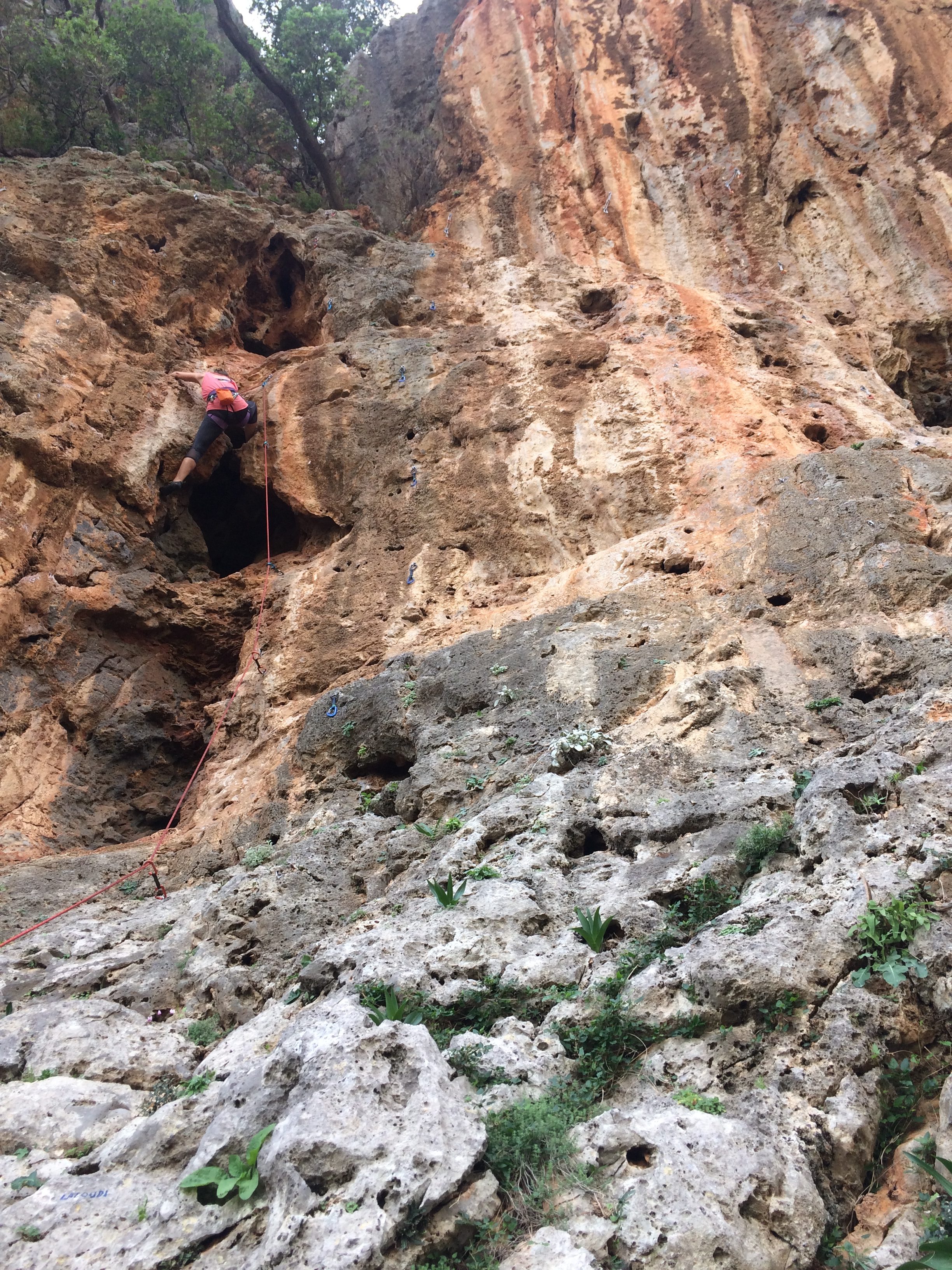 Am zweiten Klettertag ging es hoch hinaus zur Hauptwand Leonidios, dem alles überstrahlenden Riegel „Kokkinovrachos“. Er ist ist viele Untersektoren unterteilt und bietet sowohl ohne Ende Sportkletterrouten, aber auch viele Mehrseillängen, die für uns allerdings diesmal nicht von Interesse waren.