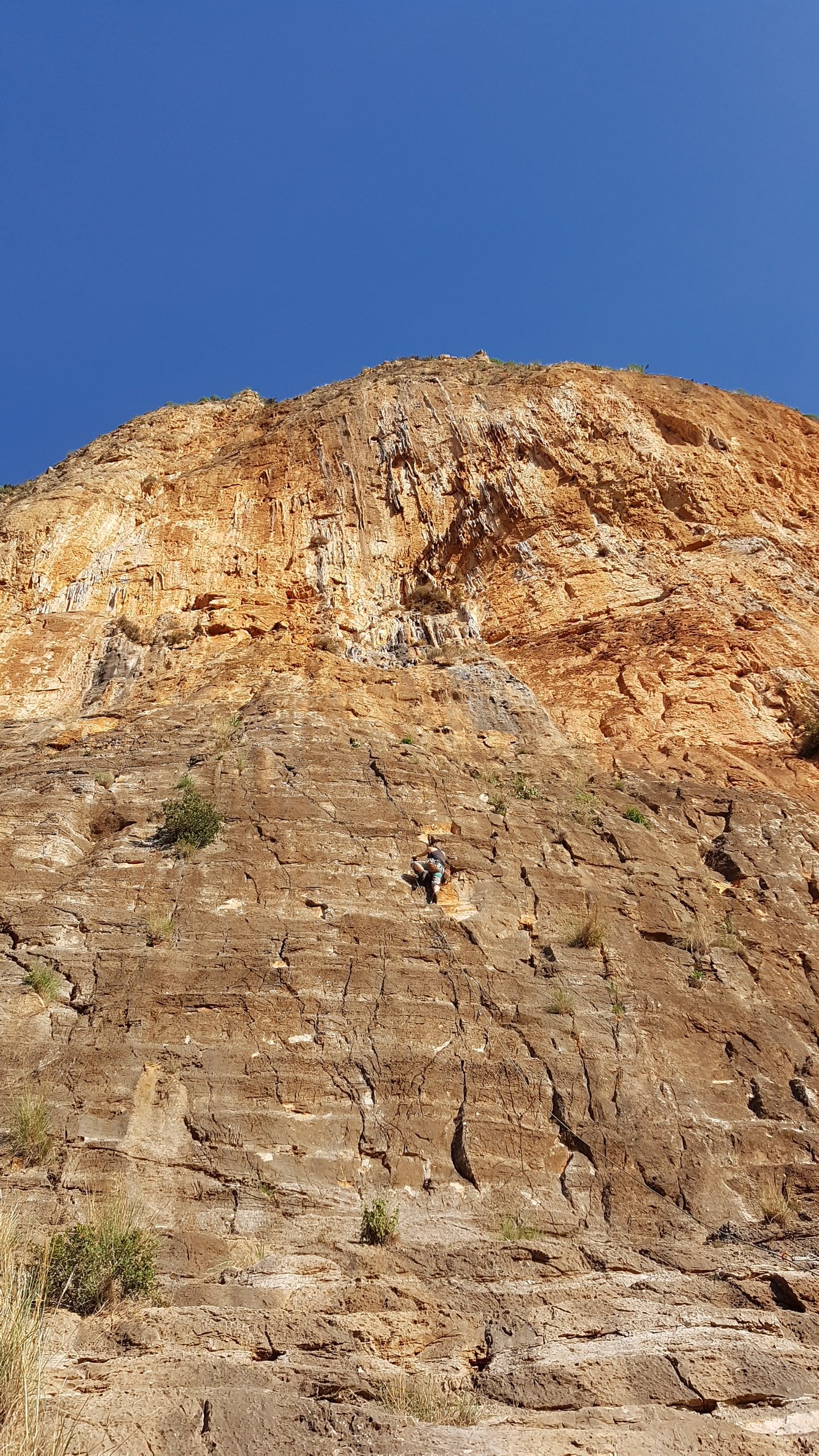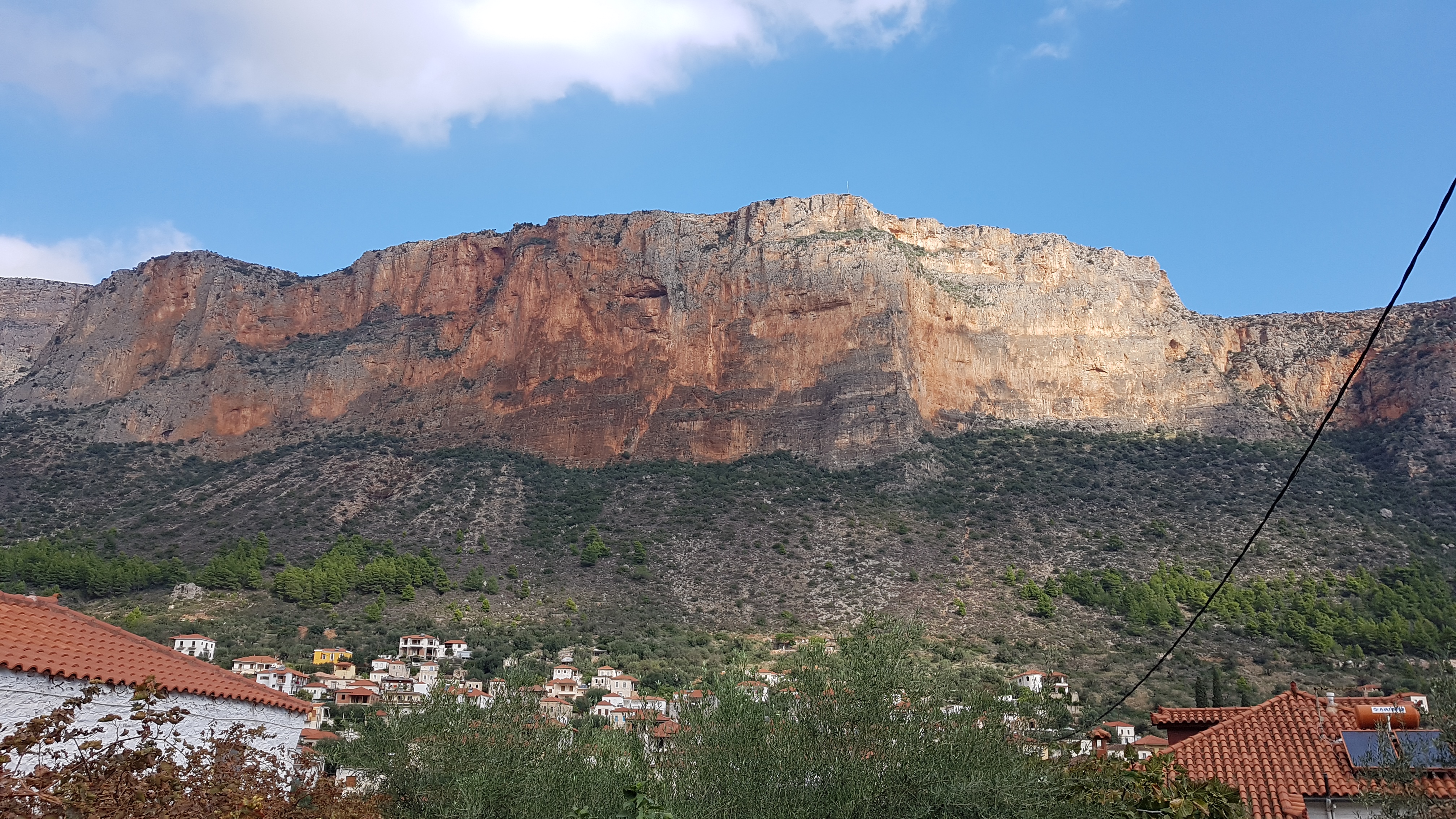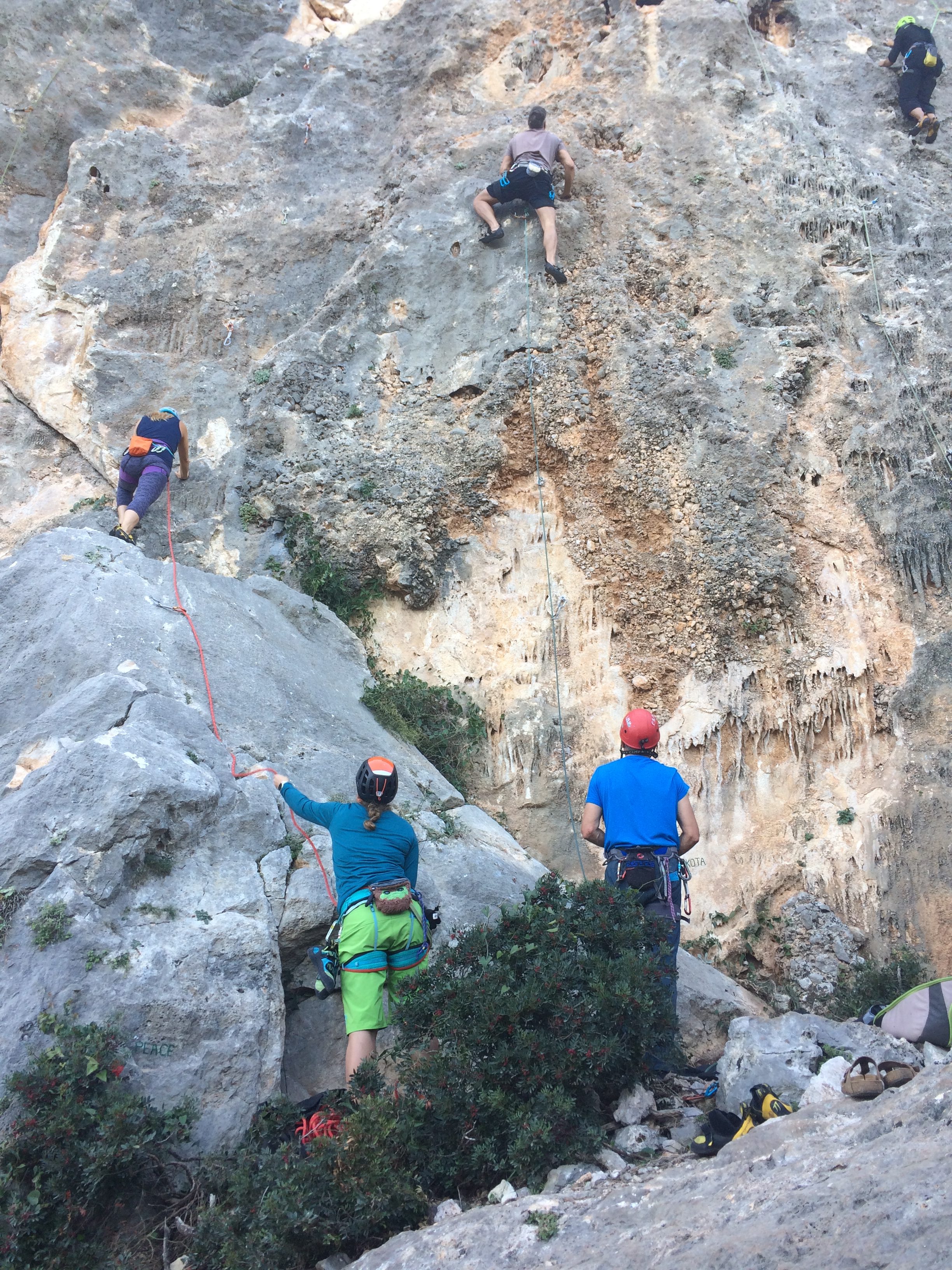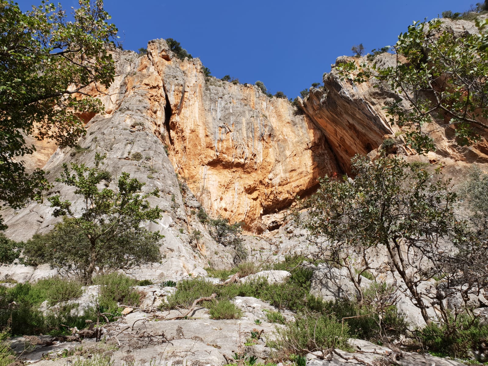 Am zweiten Klettertag ging es hoch hinaus zur Hauptwand Leonidios, dem alles überstrahlenden Riegel „Kokkinovrachos“. Er ist ist viele Untersektoren unterteilt und bietet sowohl ohne Ende Sportkletterrouten, aber auch viele Mehrseillängen, die für uns allerdings diesmal nicht von Interesse waren.