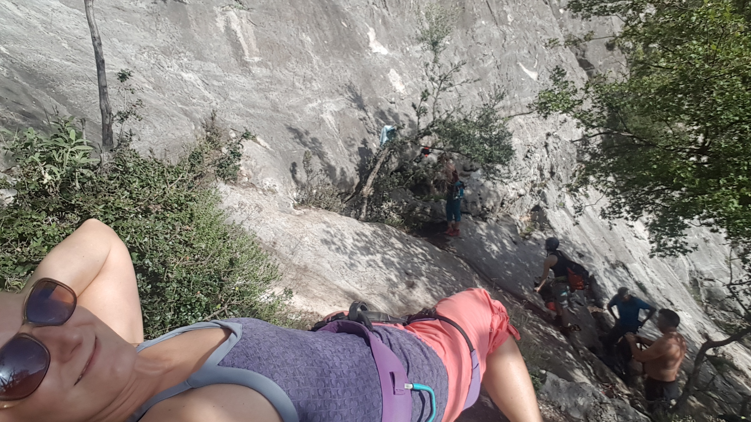Auch wenn dann noch eine riesige Gruppe griechischer Kids mit Kletterlehrern ankam, die uns für komplett wahnsinnig halten musste, dass wir hier in der prallen Sonne klettern, sah es so aus, als ob sie Spaß hatten klettern auszuprobieren. Diese freien Kletterkurse wurden auch im Zuge des Climbing Festivals abgehalten. Tolle Idee die Locals so die verrückte Kletterei ein wenig näher zu bringen.