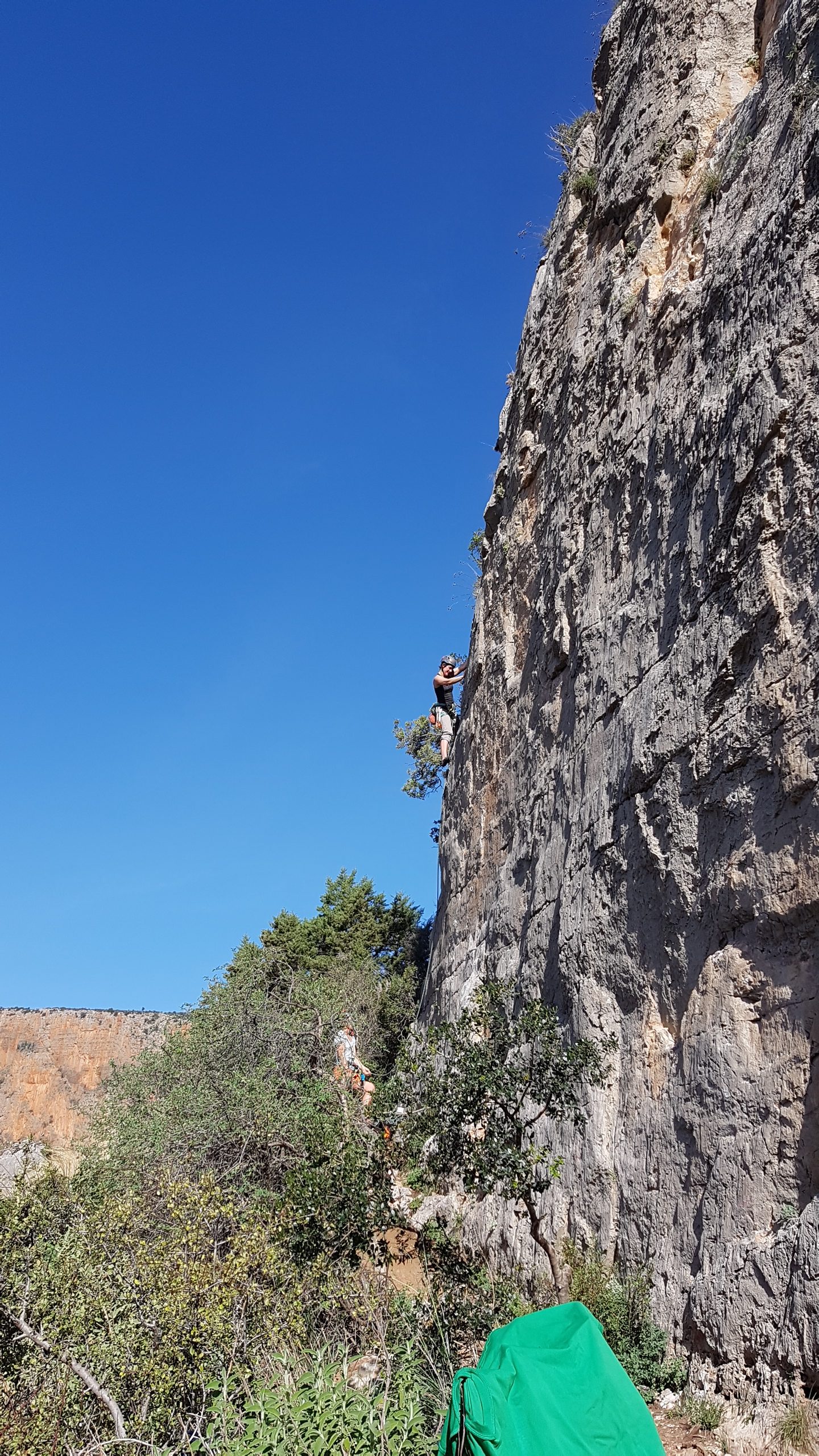 Da wir direkt aus dem Ort Leonidio hochlaufen konnten, ließen wir an diesem Tag das Auto zu Hause stehen und machten uns zu Fuß auf den Weg. Nach einer kleinen Wegfindungssuche, waren wir dann auch – zum Glück wieder relativ früh und mit wenigen Leuten (das sollte sich noch ändern) am Fels und konnten zumindest für eine knappe Stunde die Ruhe und die grandiosen Touren genießen.