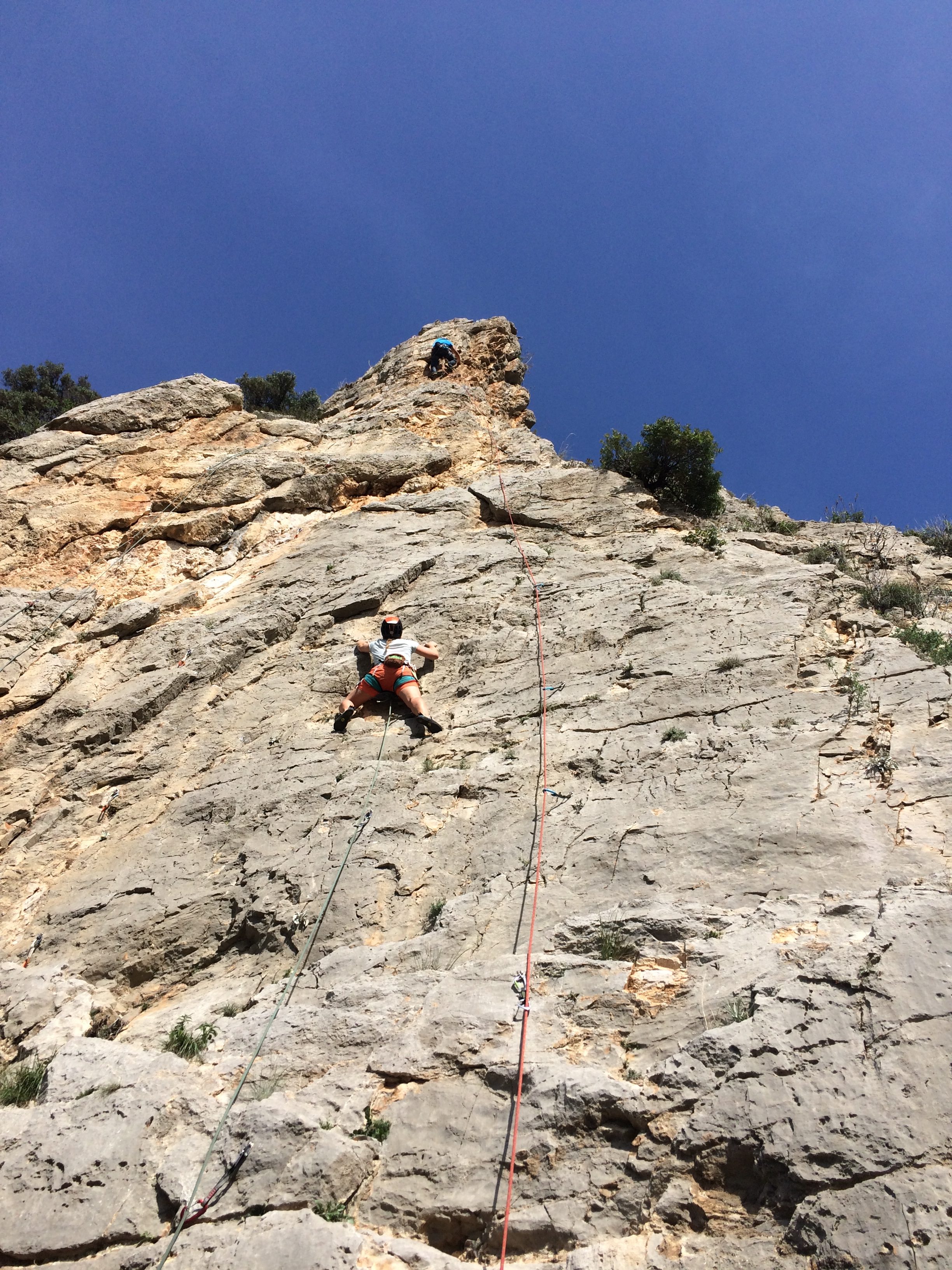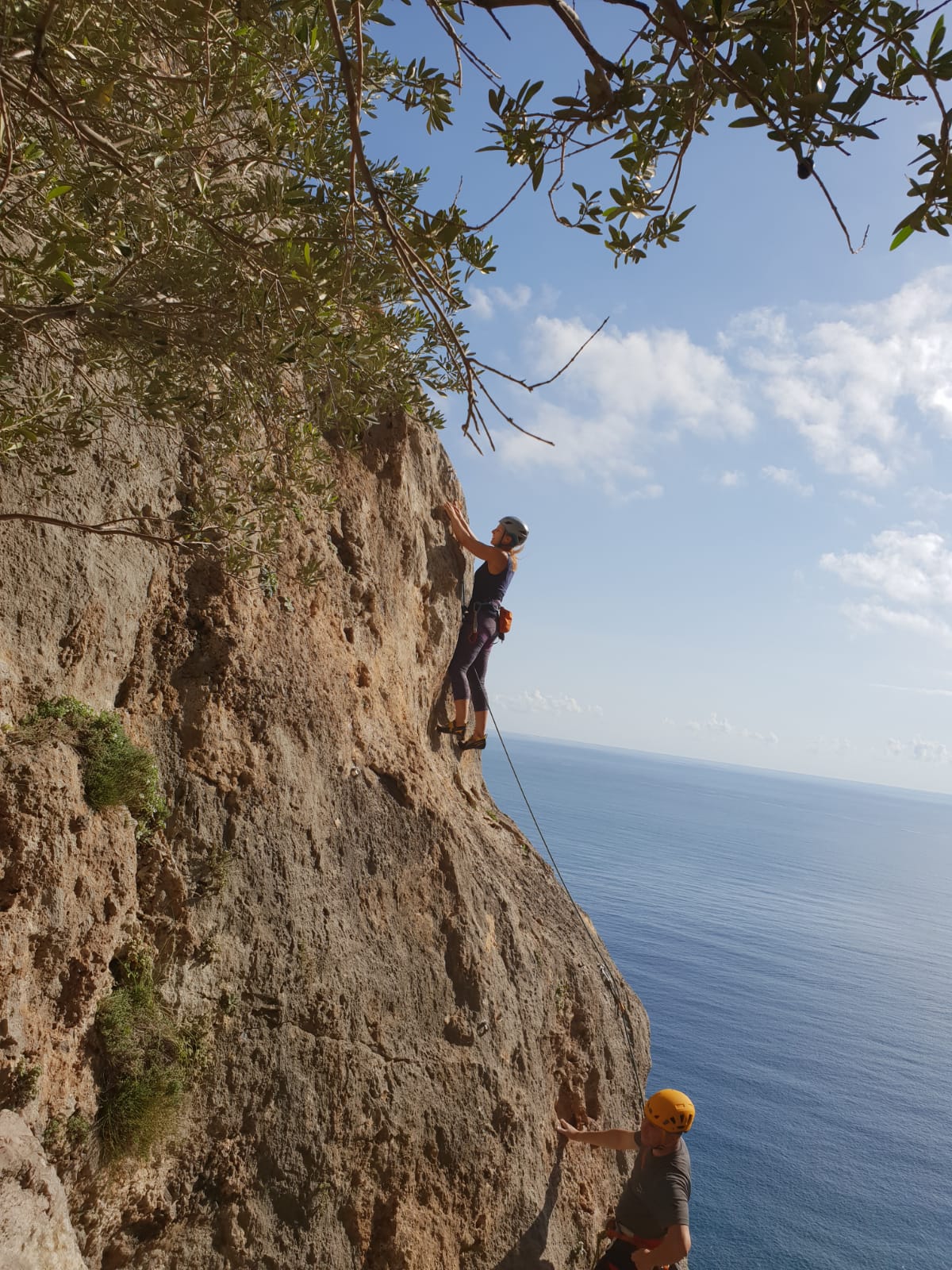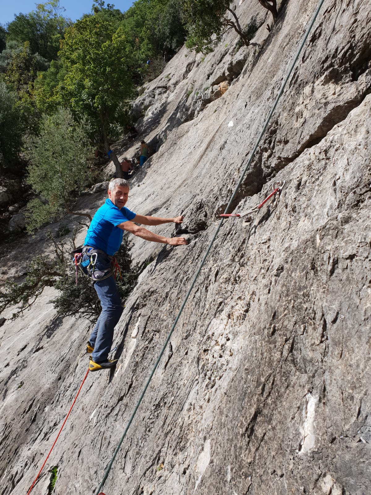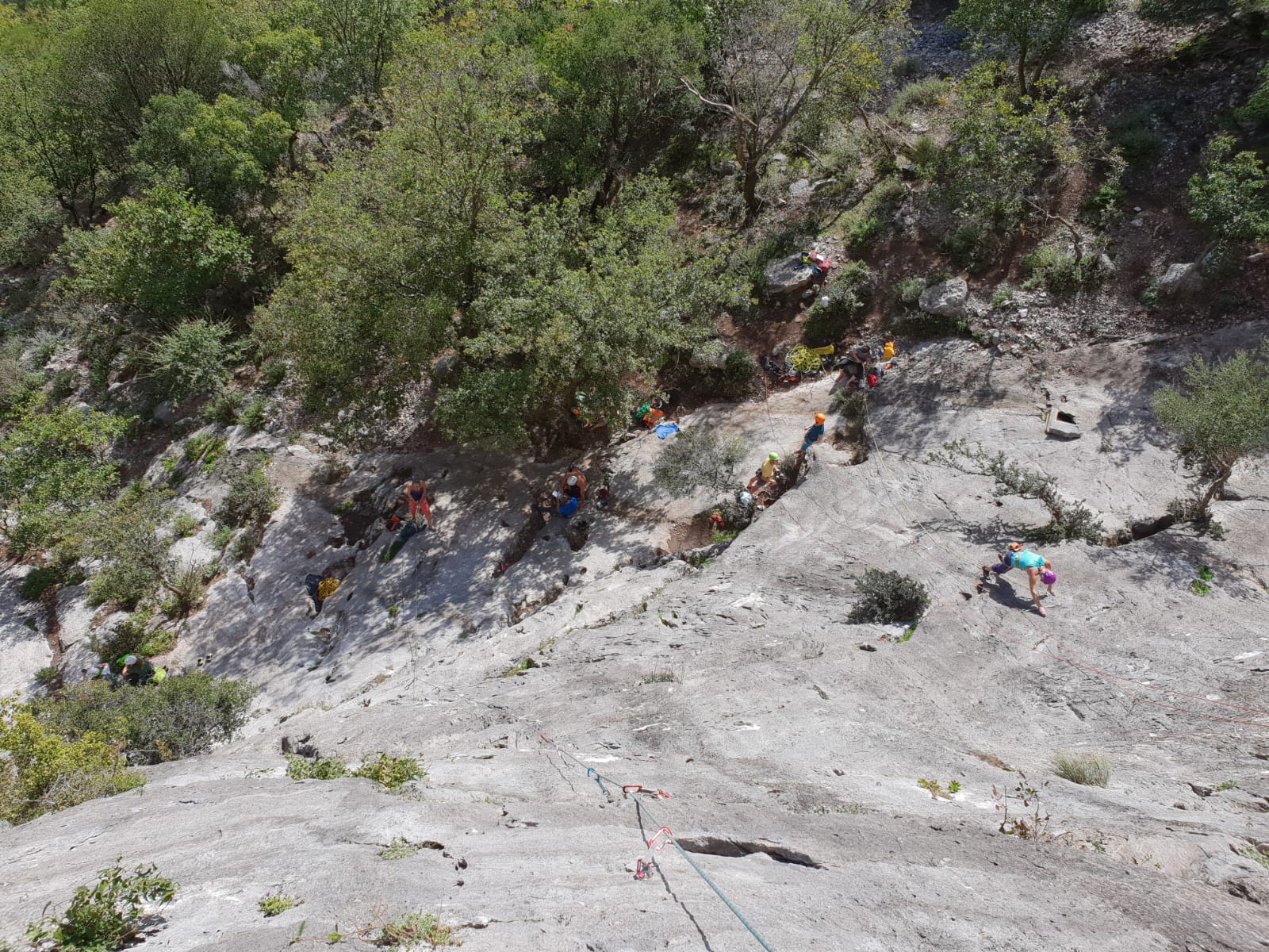 Nachdem doch alle schon gut Felserfahrung hatten, sind wir nach einem kurzen Sicherungscheck meinerseits in die ersten Routen gestartet. Es gab dort einiges im französischen 5ten Grad. Einige davon waren auch mal etwas anspruchsvoller 😉 Danach haben wir uns an Routen mit den lustigen Namen „Ultra Mega Shit“ (so schlimm wars dann gar nicht) und weiter oben im Sektor an wunderschöne Touren wie „Piece“ und „Ronti“ in den Bereich 6a und 6a+ vorgearbeitet. Für einige durchaus überraschend das schon gleich am ersten Tag zu schaffen. Congrats! Einige wollten danach noch schnell ins Wasser springen, also ab zum Strand und in die Fluten stürzen. Kaum war die Sonne weg, wurde es aber dann schon ganz schön frisch….