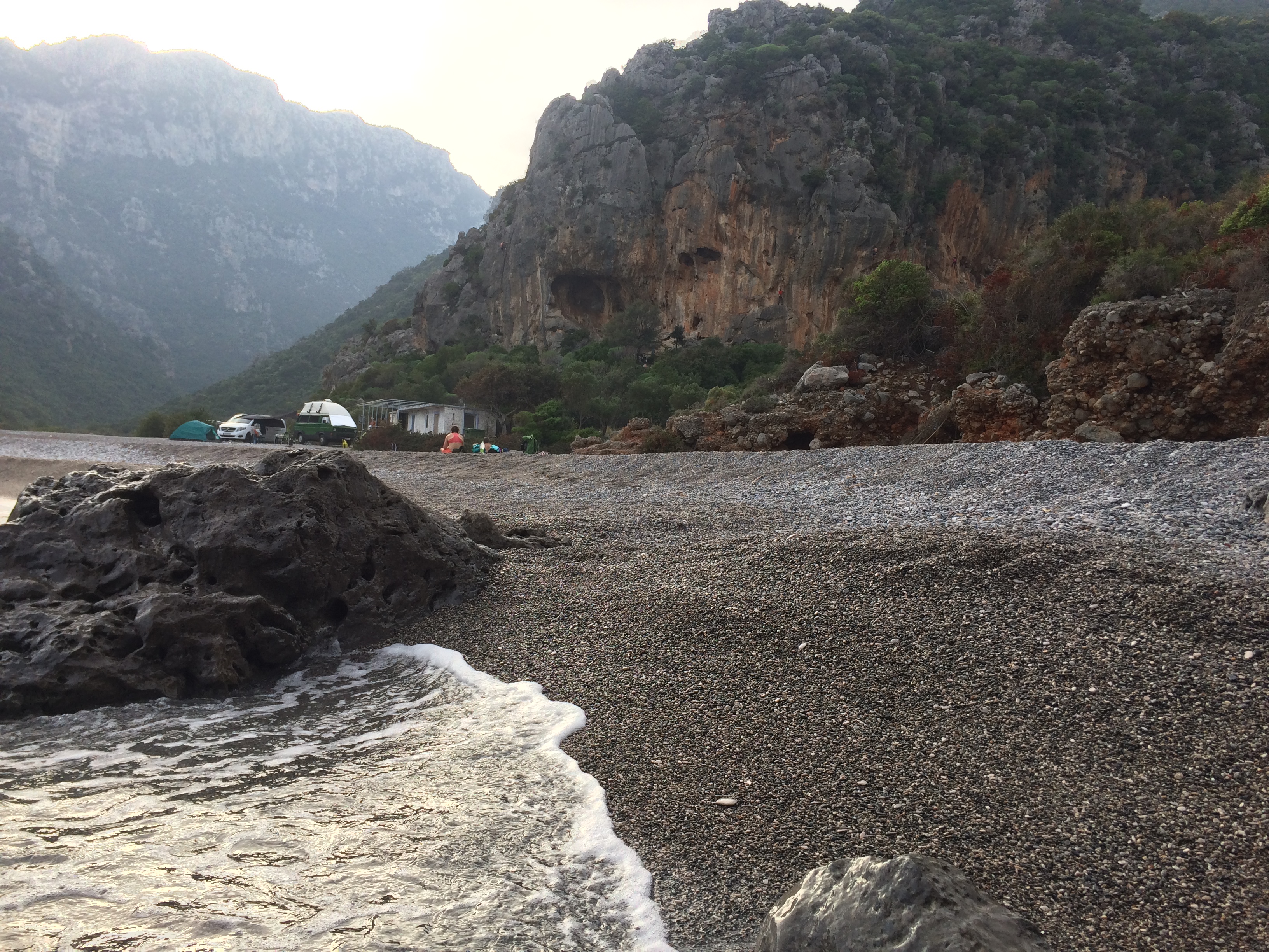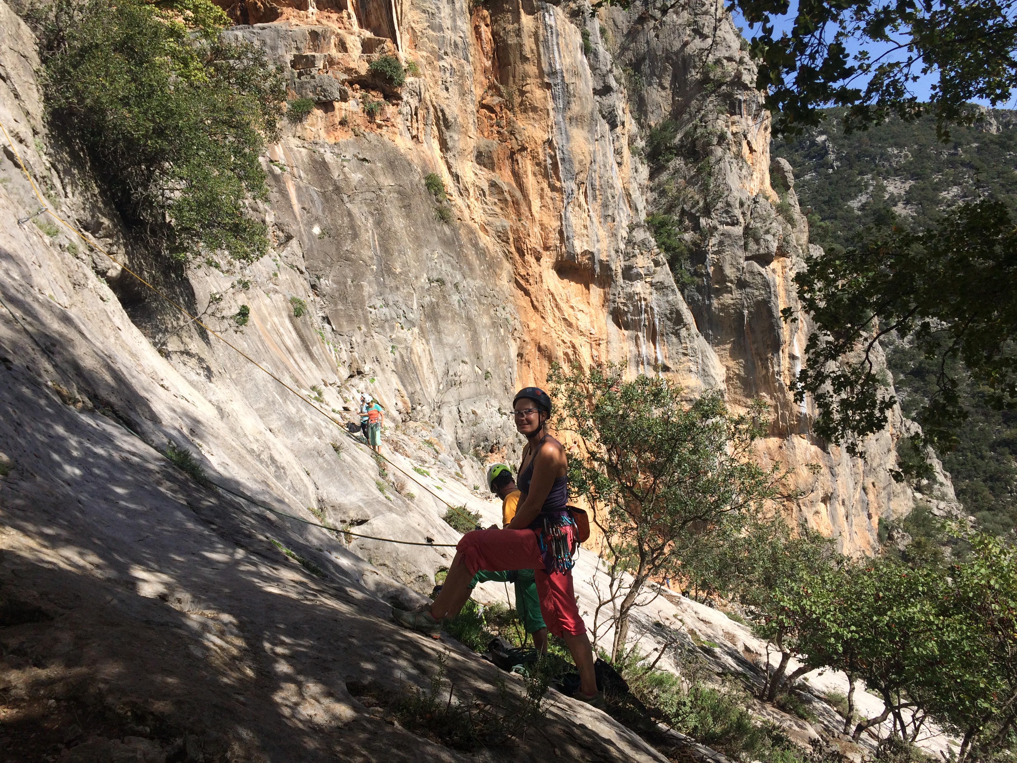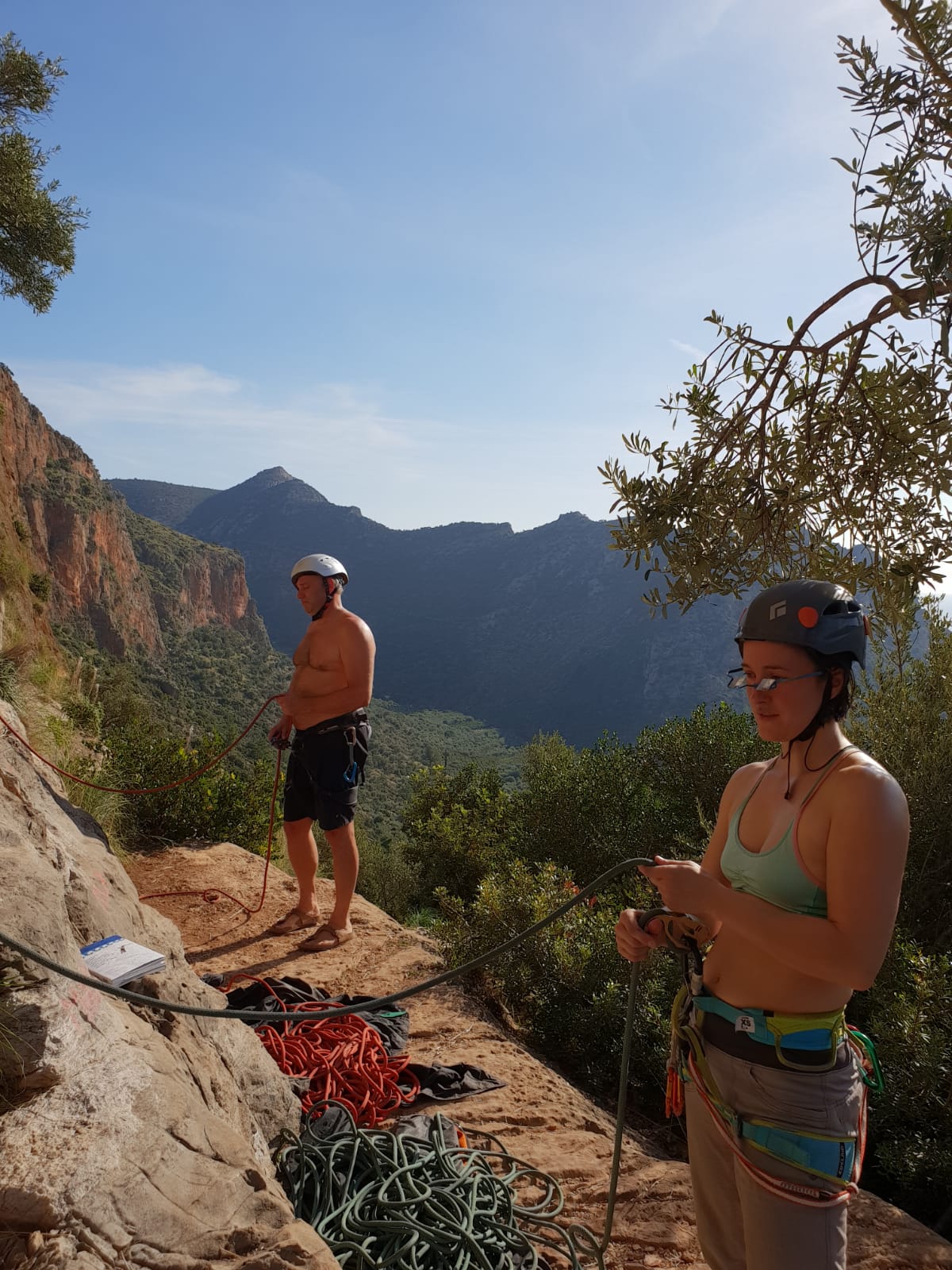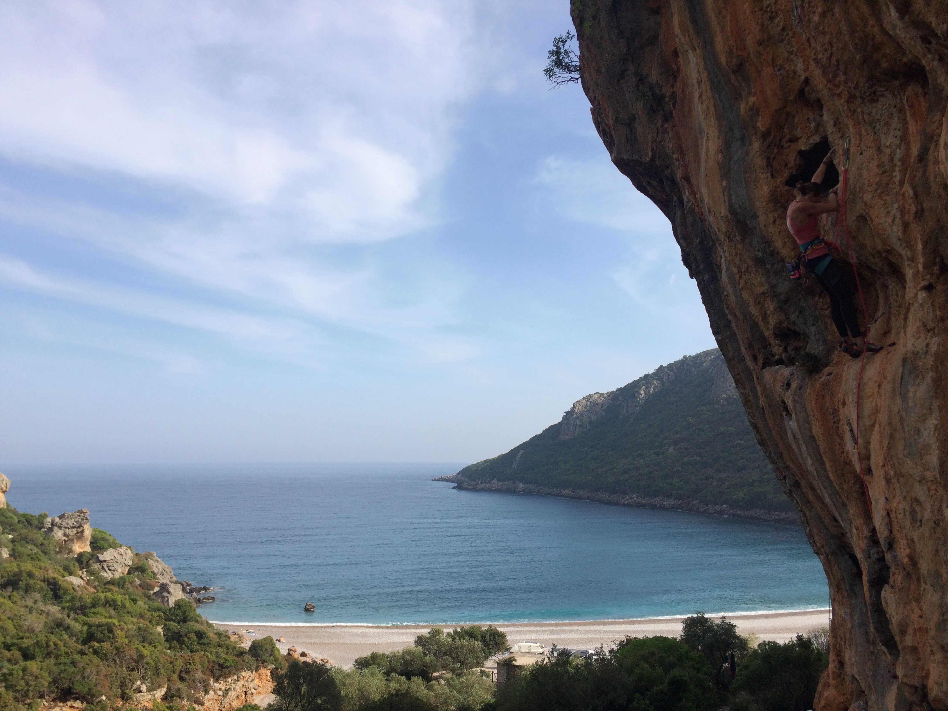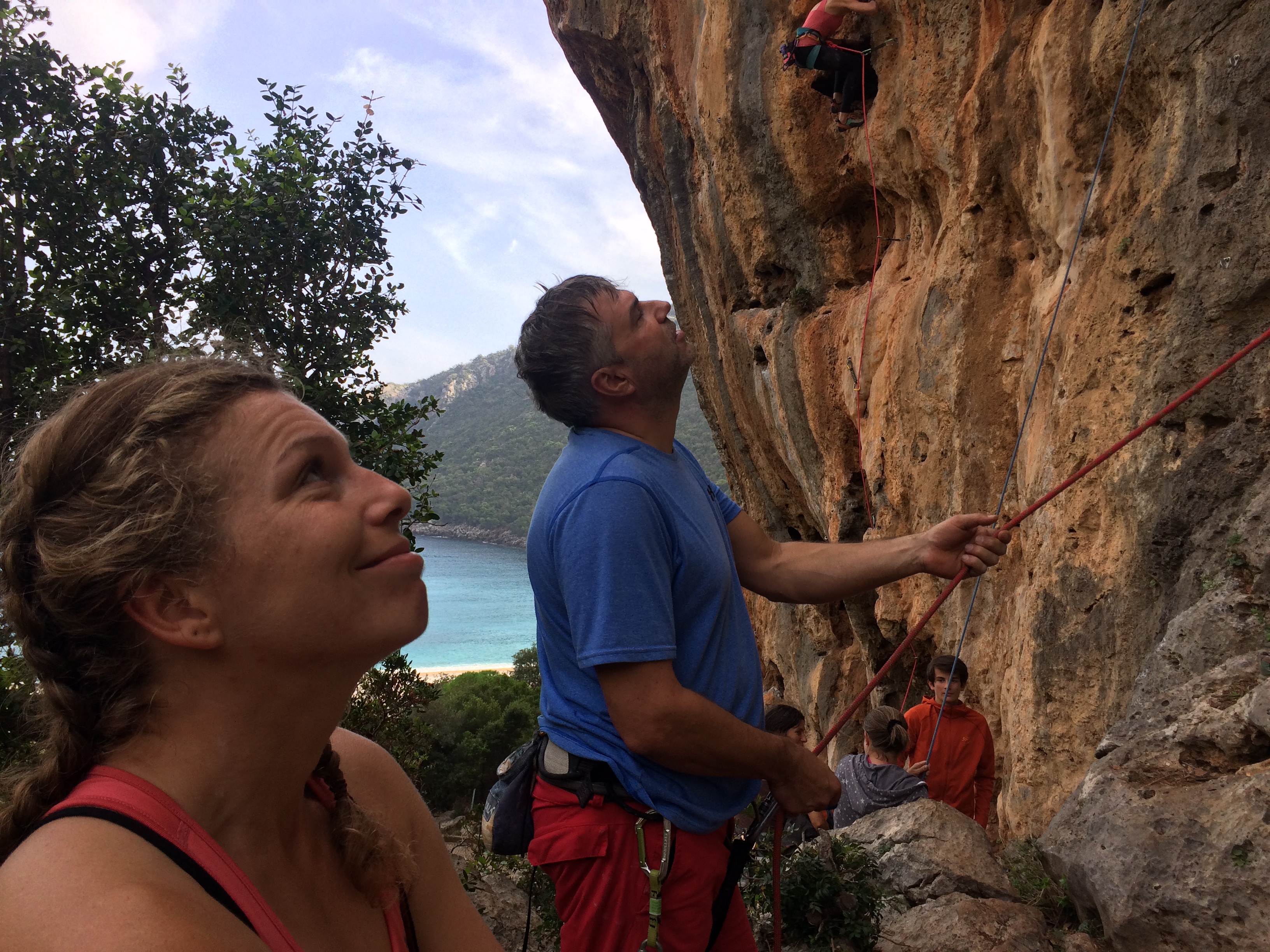 Nachdem doch alle schon gut Felserfahrung hatten, sind wir nach einem kurzen Sicherungscheck meinerseits in die ersten Routen gestartet. Es gab dort einiges im französischen 5ten Grad. Einige davon waren auch mal etwas anspruchsvoller 😉 Danach haben wir uns an Routen mit den lustigen Namen „Ultra Mega Shit“ (so schlimm wars dann gar nicht) und weiter oben im Sektor an wunderschöne Touren wie „Piece“ und „Ronti“ in den Bereich 6a und 6a+ vorgearbeitet. Für einige durchaus überraschend das schon gleich am ersten Tag zu schaffen. Congrats! Einige wollten danach noch schnell ins Wasser springen, also ab zum Strand und in die Fluten stürzen. Kaum war die Sonne weg, wurde es aber dann schon ganz schön frisch….