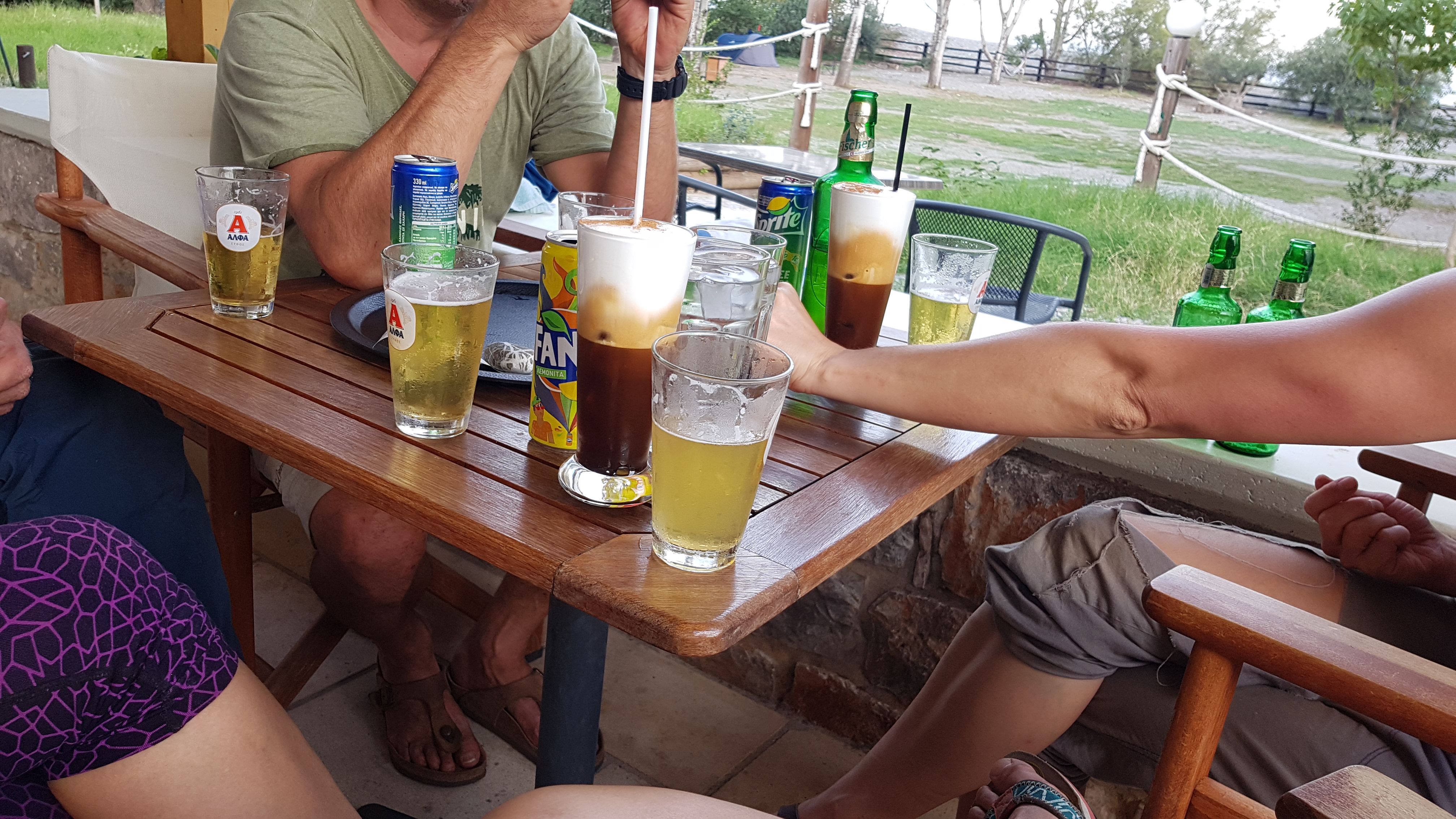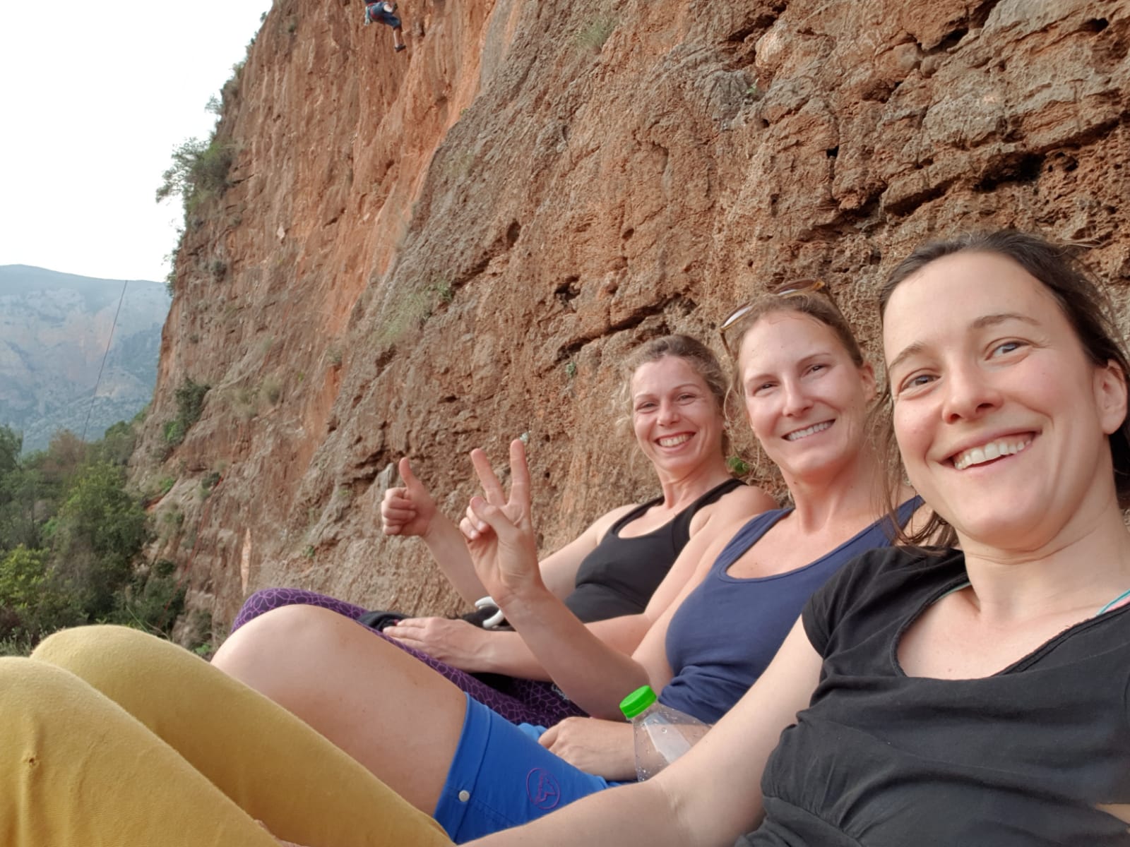 Während Felix noch seine letzten Touren abspulte, machten es sich die Mädels schon mal zum Sonnen am Fels bequem 🙂 Nach einem langen Klettertag stiegen wird ab und machten zum wohlverdienten After Climbing Drink Station im Panjika Café, das zur Panjika Cooperative gehört und den umfangreichen Kletterführer zu Leonidio mit einer zweiten Ausgabe 2018 herausgebracht hat.