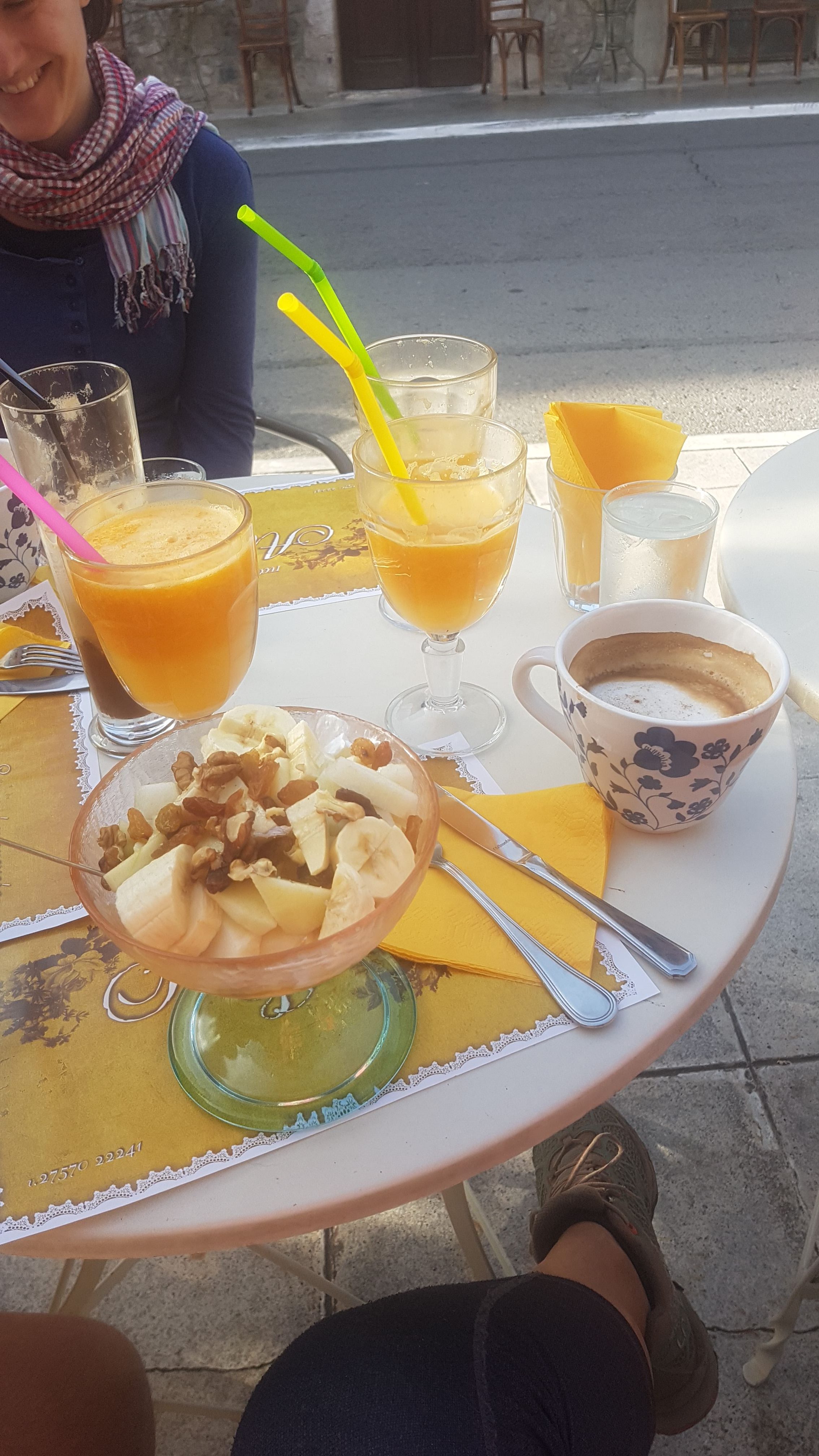 Doch zunächst wurde mal ausnahmsweise außer Haus, nämlich bei Anna im Café ausgiebig gefrühstückt. Neben Kaffee, Orangensaft, Müsli mit Joghurt, Croissants und Pancakes machte vor allem Christines Club Sandwich Bestellung große Augen bei Anna. Als das Essen dann gebracht wurde, wussten wir warum… Pancakes & Club Sandwich war dann doch eine etwas große Herausforderung, aber gemeinsam im Team schafften wir schließlich alles zu verputzen. Fertig und voll für den Strand düsten wir also mit dem Auto los. Die Fahrt zur Bucht von Vlychada dauerte dann doch so 1 1/4 Stunden. Durch die neue Berglandschaft, die kleinen Örtchen und die vielen Gespräche im Auto wurde uns aber nicht langweilig.