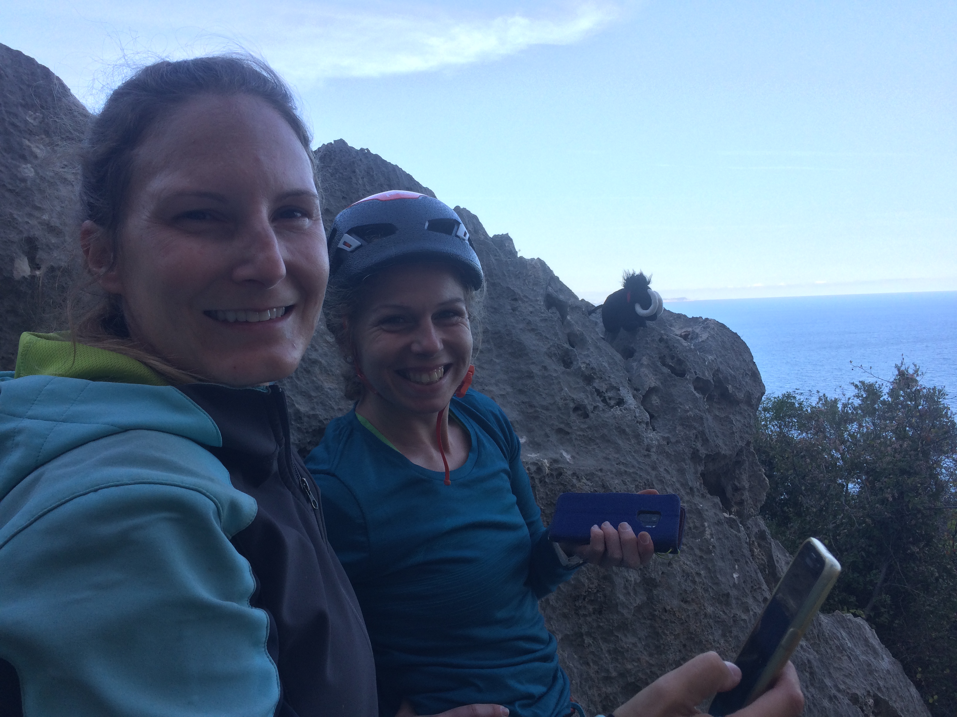 Dort angekommen gabs erstmal ein bisschen Lese-, Bade- und Relaxzeit am Strand und im Wasser. Als dann schön der Schatten in der Wand angekommen war, gingen Felix & ich hoch zum Fels, um dann doch noch zu Klettern 😉 Stephanie & Christine besuchten uns für ein paar recht glitschige Touren und beschlossen, am Strand ist es doch schöner. Doch ewig viel kletterten Felix und ich auch nicht – 5-6 Touren, ein Ruhetag eben 😉 Zum Abschluss muss man jedoch sagen – ohne die legendäre Tour Le Sabre hätten wir echt was verpasst! Grandiose 40m abwechslungsreichste Kletterei in einem angenehmen 6a+ Schwierigkeitsgrad mit Blick auf die Bucht – was willst du mehr, Kletterherz!
