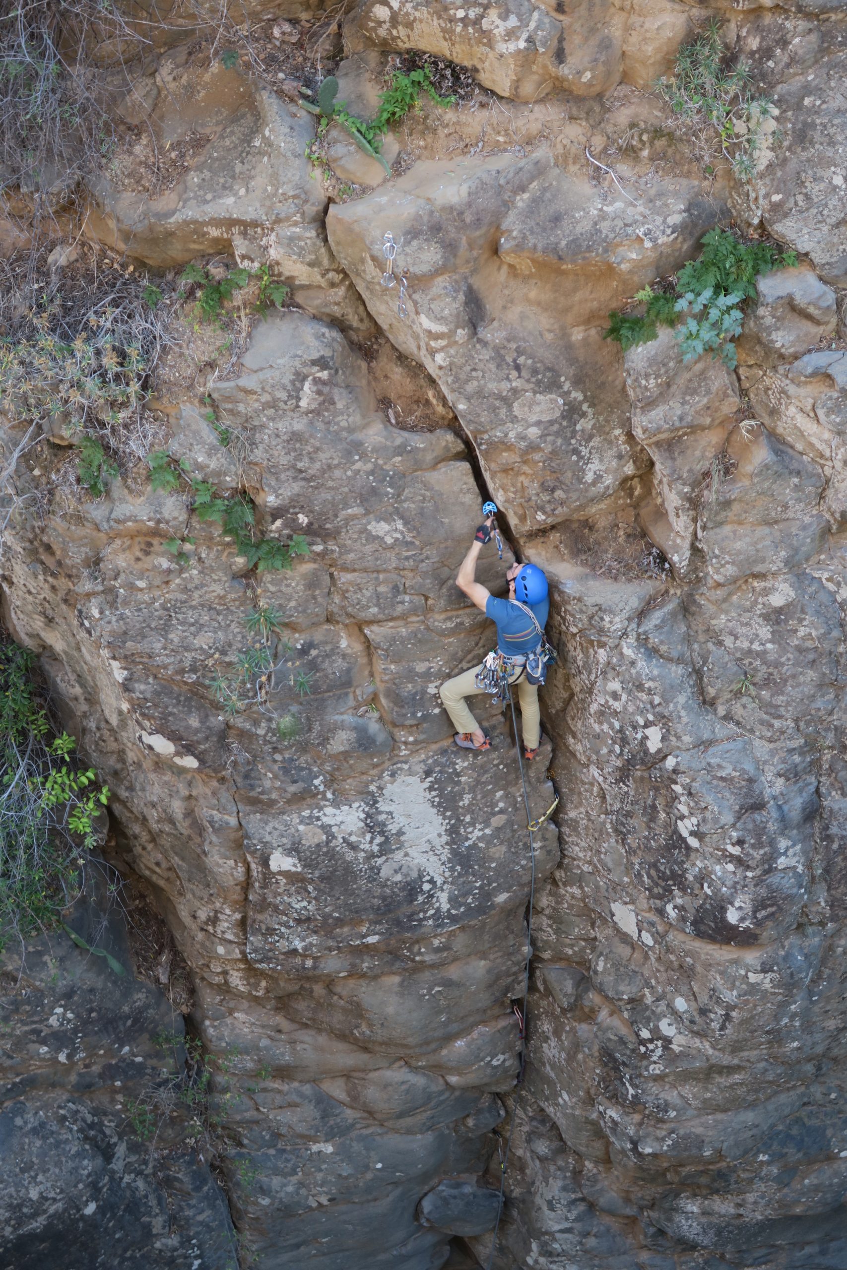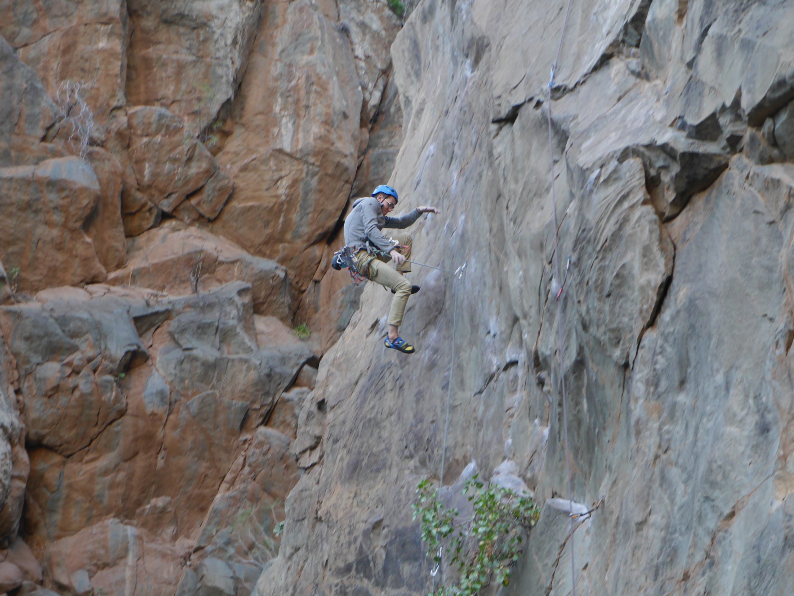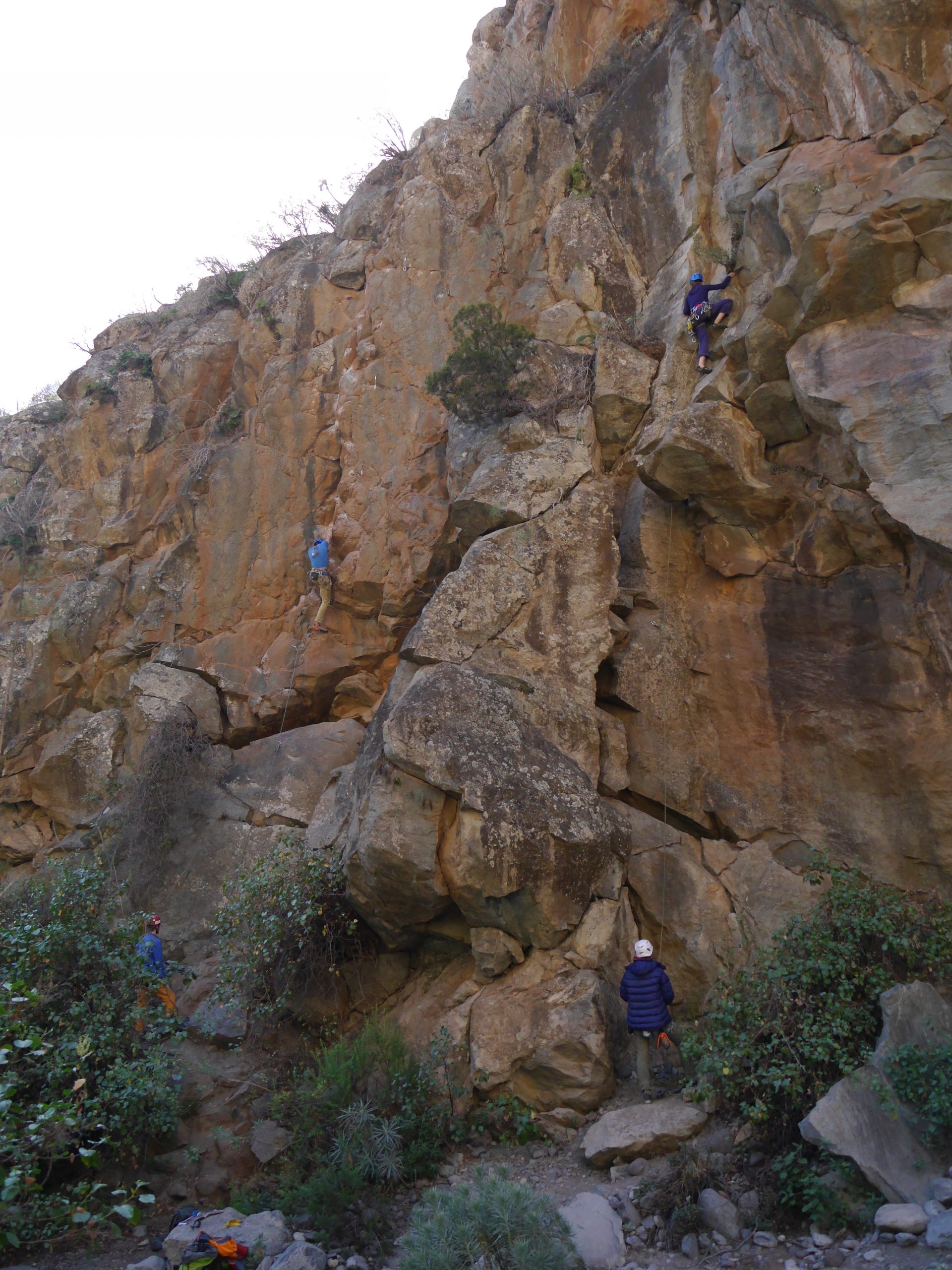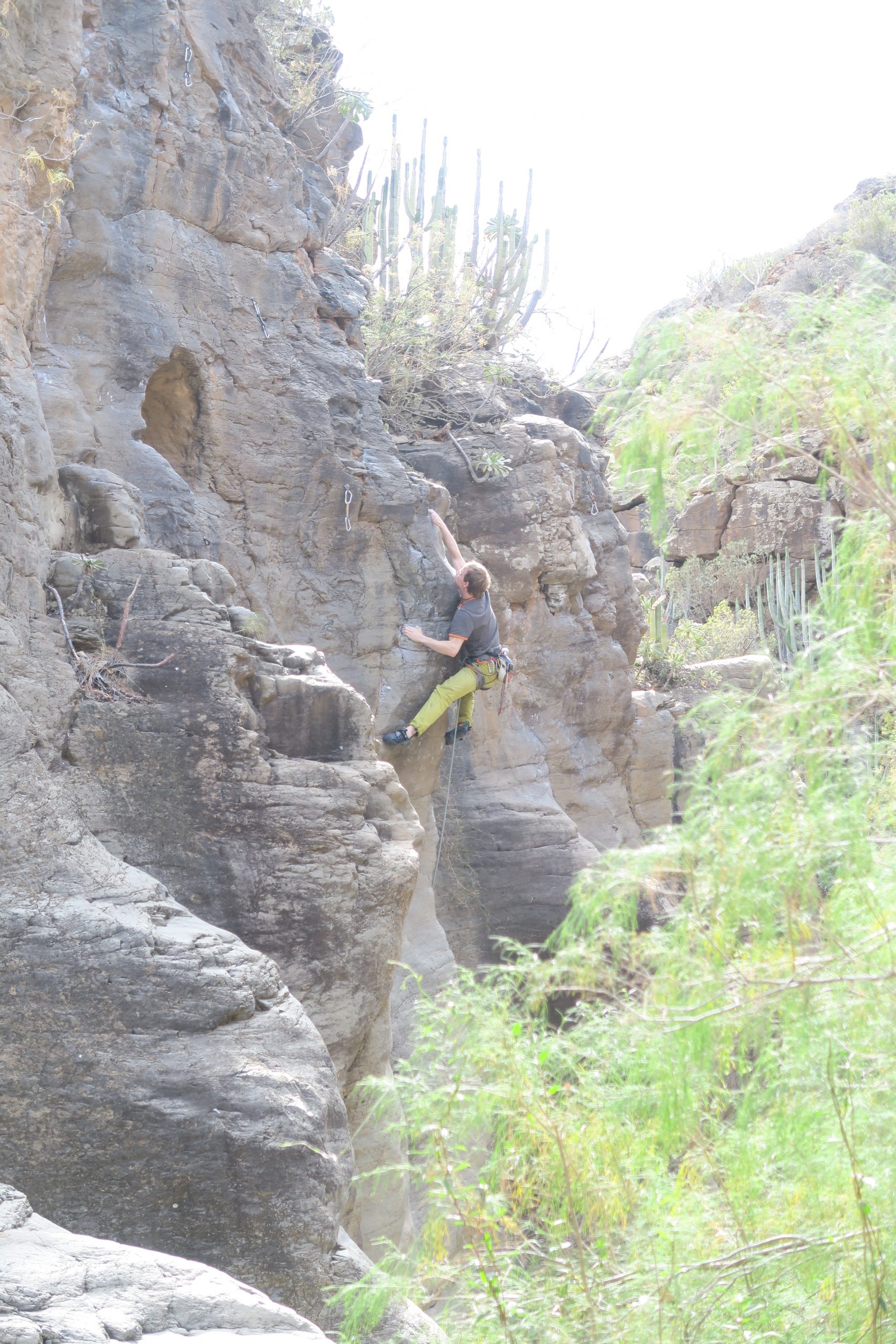 Der Fels weiter im Canyon war unten meist sehr glatt, aber nach den ersten Metern konnte man wieder bei rauen Griffen zupacken. Caroline und Britta nutzen den Restschatten in den Touren „La becaria“ (5) oder „Millagui“ (6a) aus, wahrend Mike und Robert in und die ersten schwereren Touren des Tages probierten: „El martillo volador“ (6b+), „Chochipolivi“ (6a) und „El vejequillo“ (6a), auch Evi und Britta probierten sich in diesen Touren und schlängelten sich an der „Piedra bermeja“ (6a) hoch und blieben bei den kürzeren Touren nebendran.
