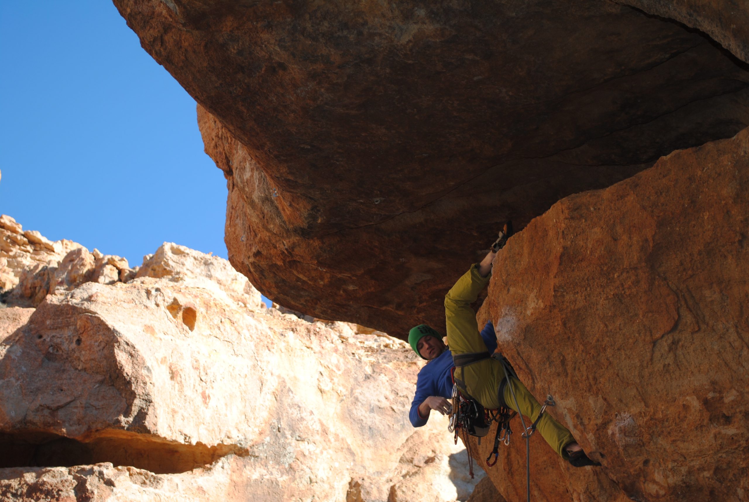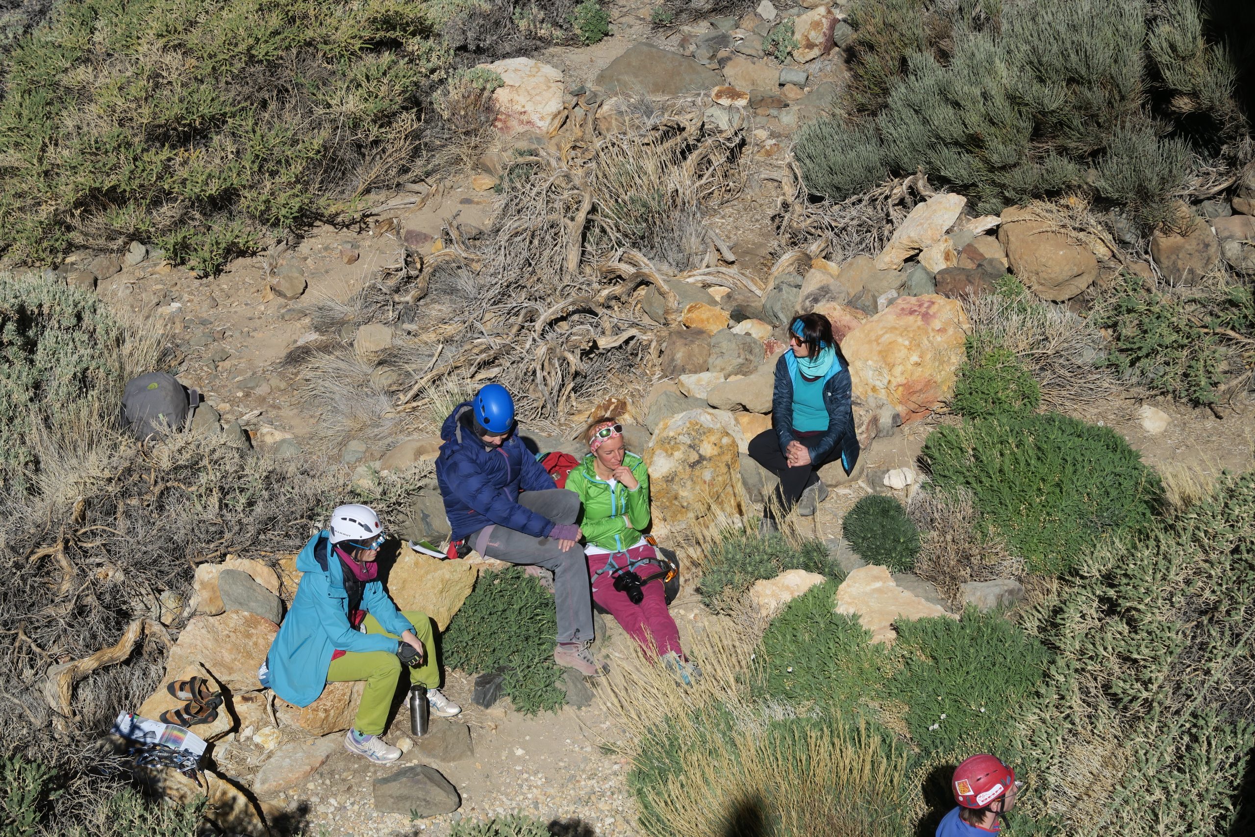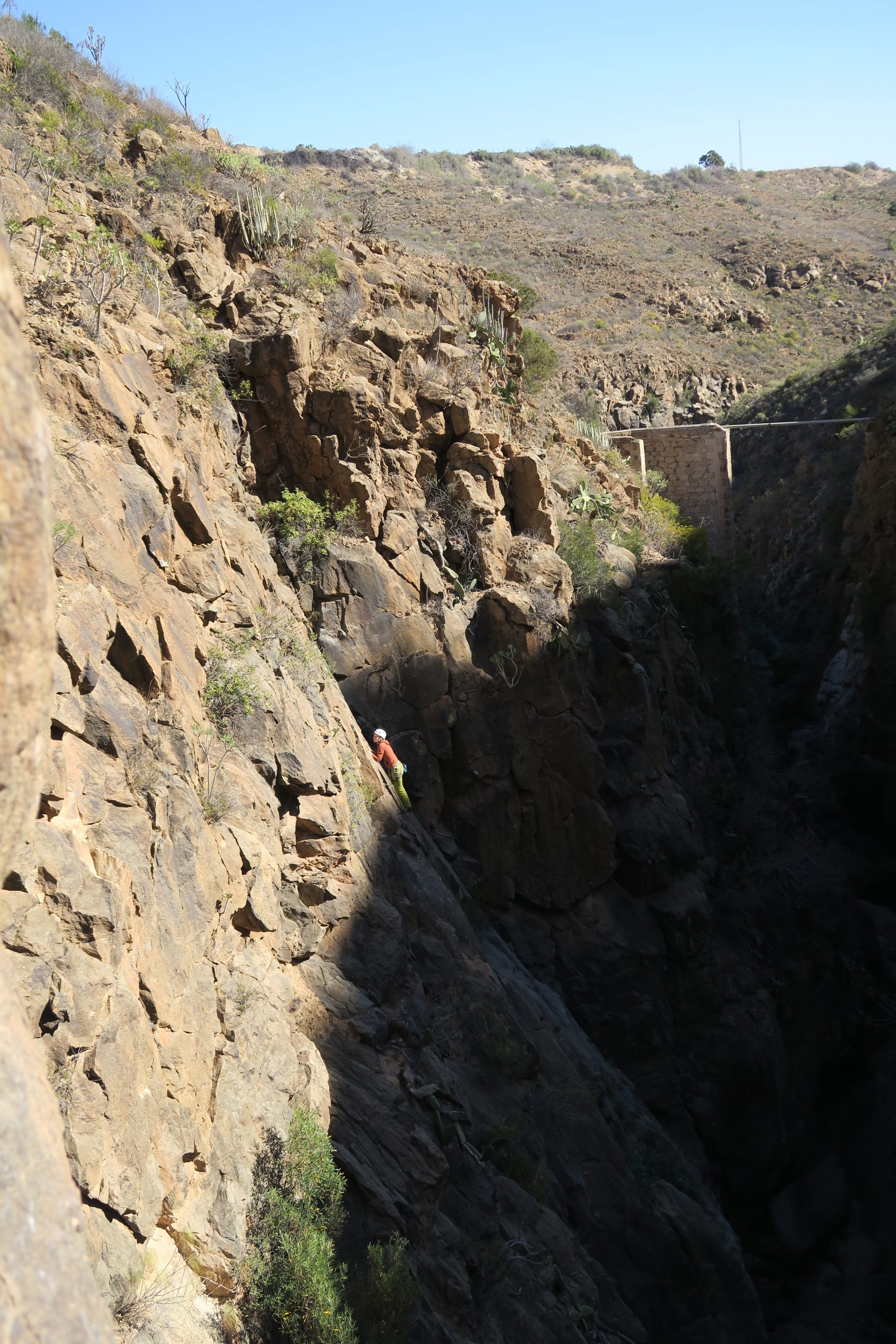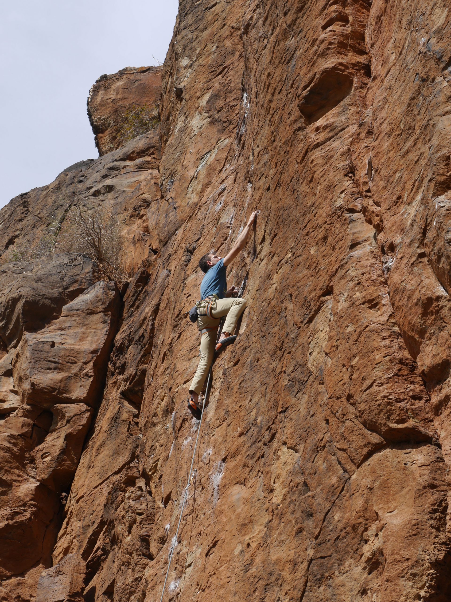 Der Fels weiter im Canyon war unten meist sehr glatt, aber nach den ersten Metern konnte man wieder bei rauen Griffen zupacken. Caroline und Britta nutzen den Restschatten in den Touren „La becaria“ (5) oder „Millagui“ (6a) aus, wahrend Mike und Robert in und die ersten schwereren Touren des Tages probierten: „El martillo volador“ (6b+), „Chochipolivi“ (6a) und „El vejequillo“ (6a), auch Evi und Britta probierten sich in diesen Touren und schlängelten sich an der „Piedra bermeja“ (6a) hoch und blieben bei den kürzeren Touren nebendran.